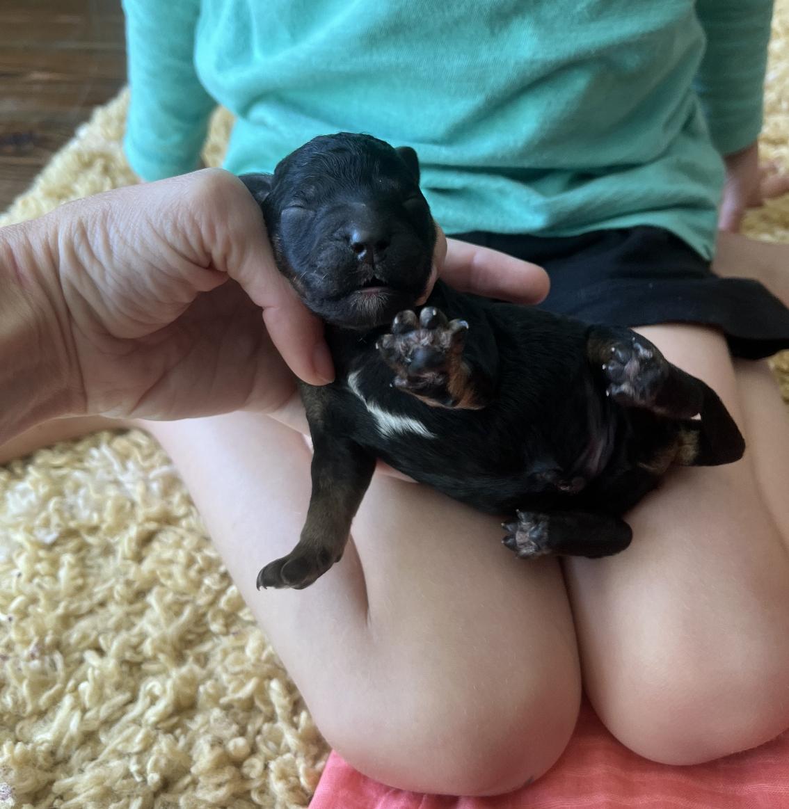 Our puppies get an incredible start when it comes to training & socialization. We have 3 kids under 7 that are pro-socializers. We live on a small farm so the pups are exposed to other adult dogs, cats, and birds at a young age. We follow a blend of BAB & puppy culture enrichment programs including early neurological stimulation and a head start on potty, crate training, & basic commands
