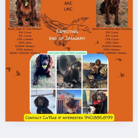 I'm CaRae R., the breeder behind Red River Boykin Spaniels located in Harrold, TX. We are committed to always responsibly breeding with the best interest of our puppies’ health and longevity at the forefront. We raise our litters in our home to help set the foundation for happy and confident puppies to transition well into their forever homes. It’s a privilege to have the opportunity to make an impact on each individual puppy!