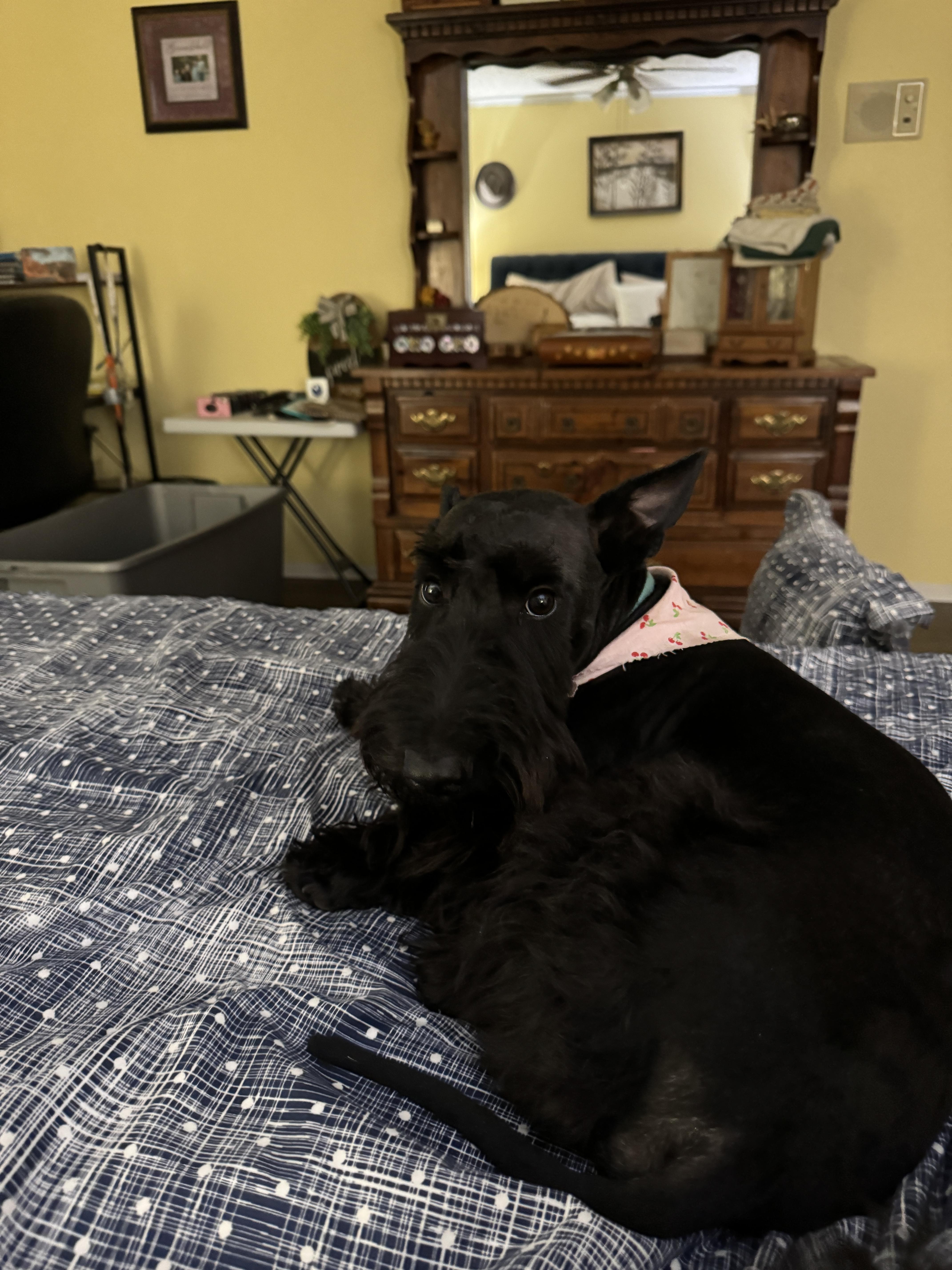 Clyde is our male Scottish Terrier. He is such a boy. Clyde is 16 months old and loves to play ball, chase squirrels and watch/bark at tv.