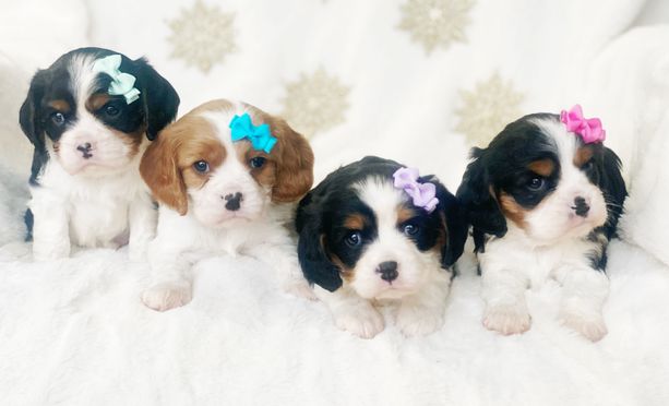 Our Cavalier King Charles Spaniel puppies include blenheim, ruby, black and tan, and tri-color. Cavapoo puppies include blenheim, tri-color, sable, black and white, black and tan, red, cream, black, and apricot. Poodle puppies include apricot, black, red, parti, and phantom. Colors will vary depending on the parent dogs.