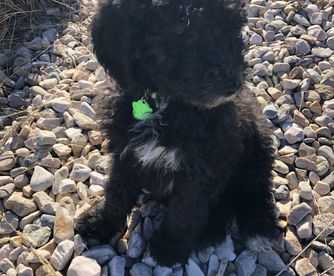 Our Poodle puppies are black. Bernedoodle puppies are black and white. Colors will vary depending on the parent dogs.