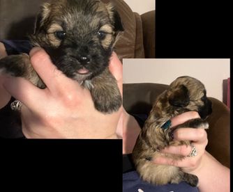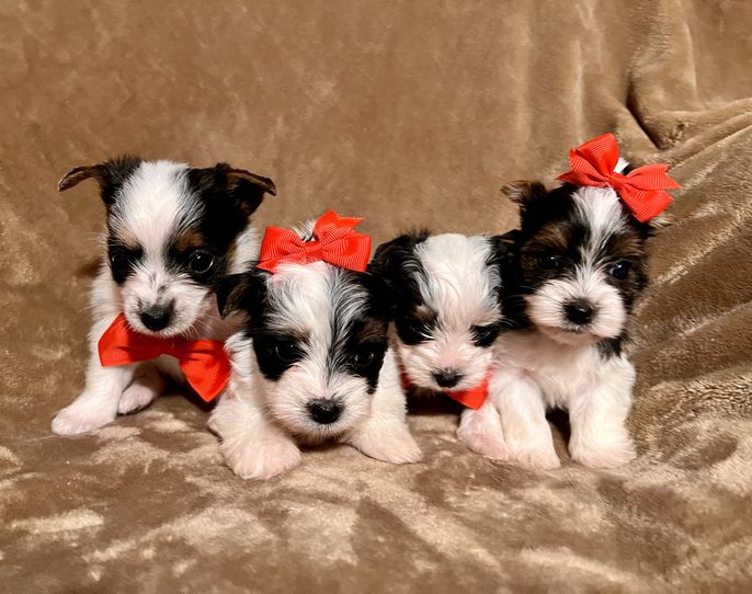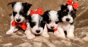 Yorkshire Terrier puppies include chocolate, tan and white, tan and white, chocolate and tan, parti, blue and gold, and black and gold. Colors will vary depending on the parent dogs.