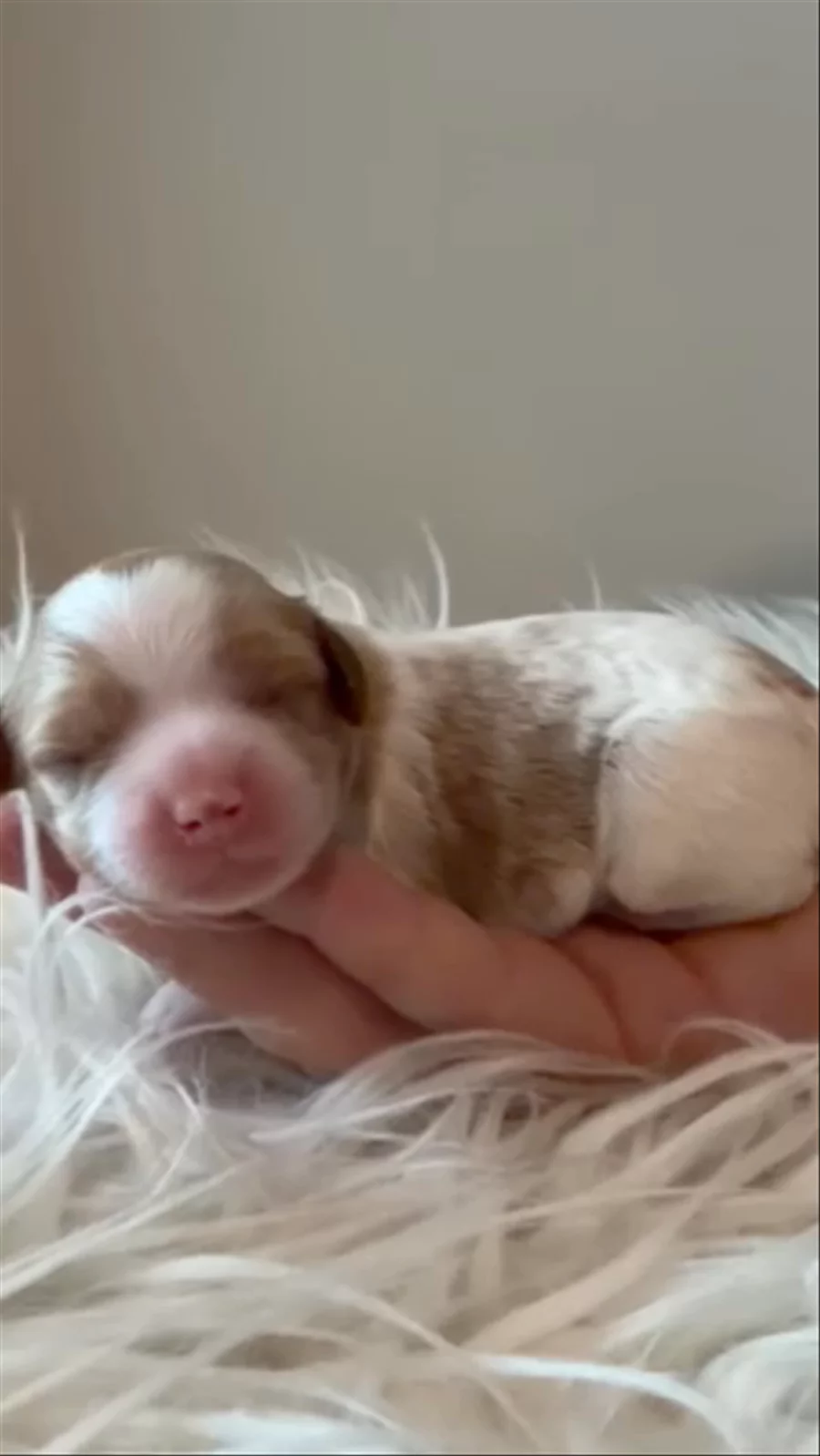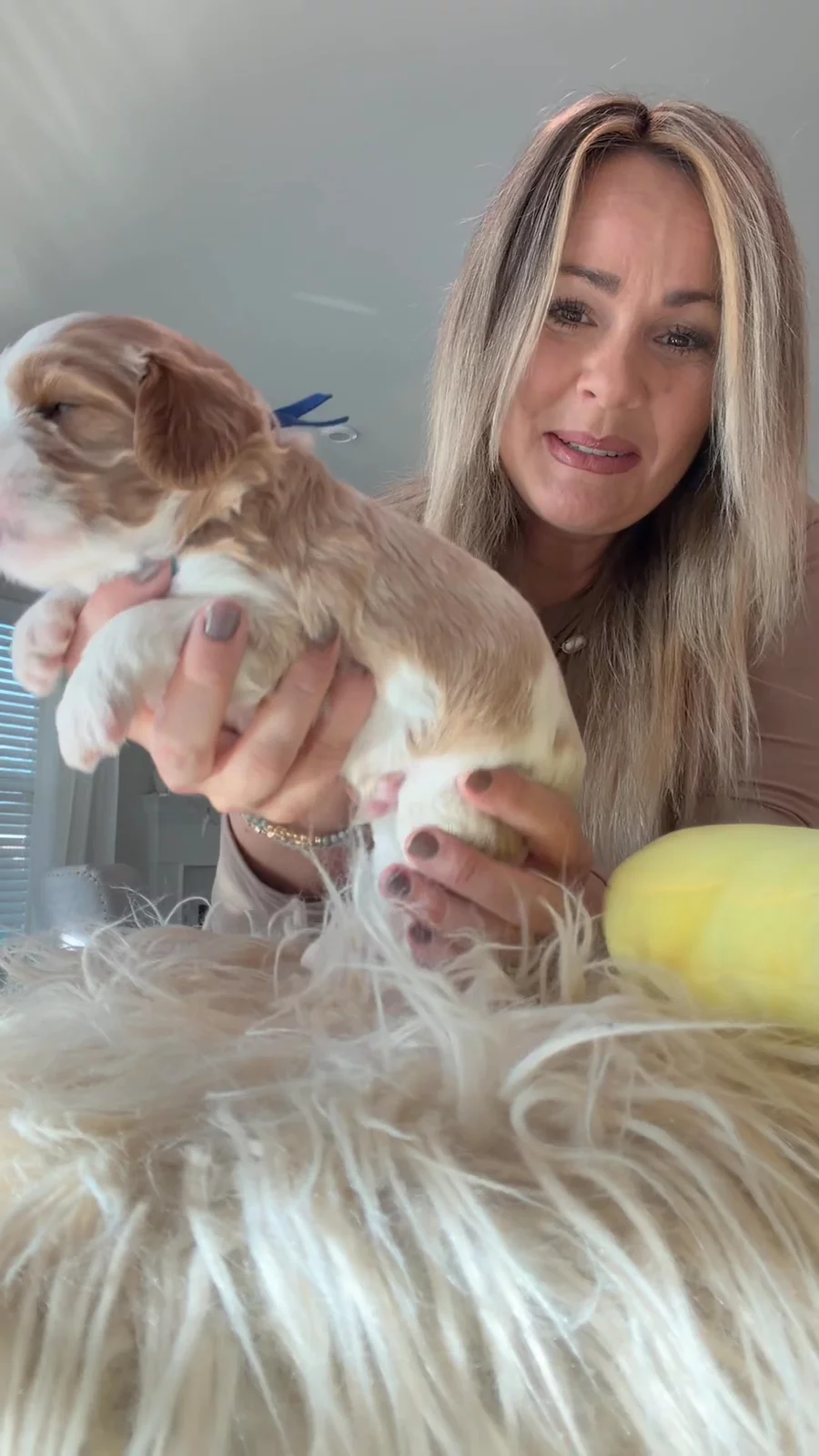 Maple is a 9 pound CKC-registered Cavapoo with a big personality and an even bigger heart. She’s equal parts diva and cuddlebug—one minute she’s strutting around like she owns the place, and the next she’s curled up in your lap for a nap. Maple loves belly rubs, pup cups, and showing off her favorite tricks (especially if snacks are involved). She’s also a rockstar mama, raising her pups with love, patience, and just the right amount of sass. Life’s never boring with Maple around!