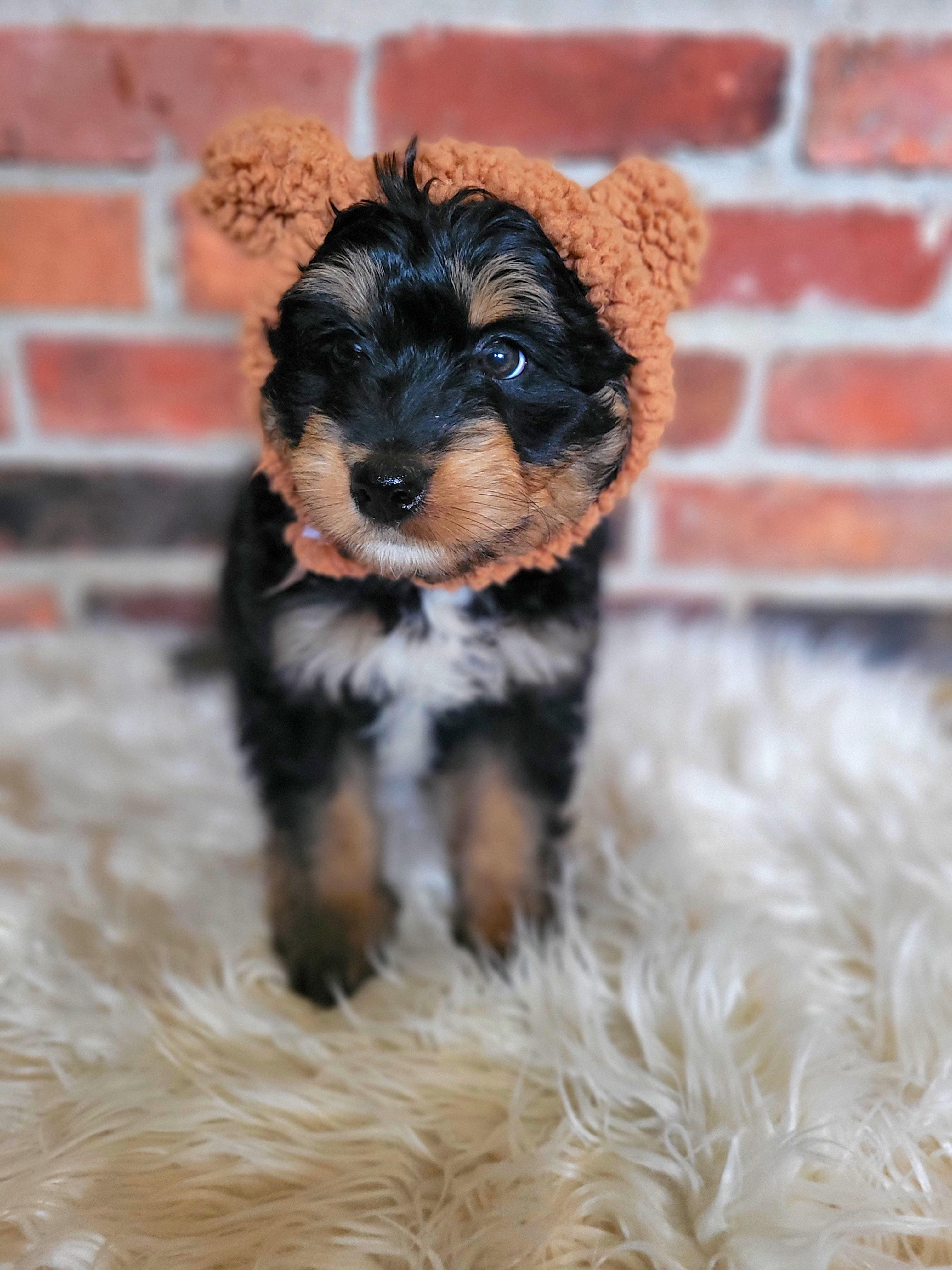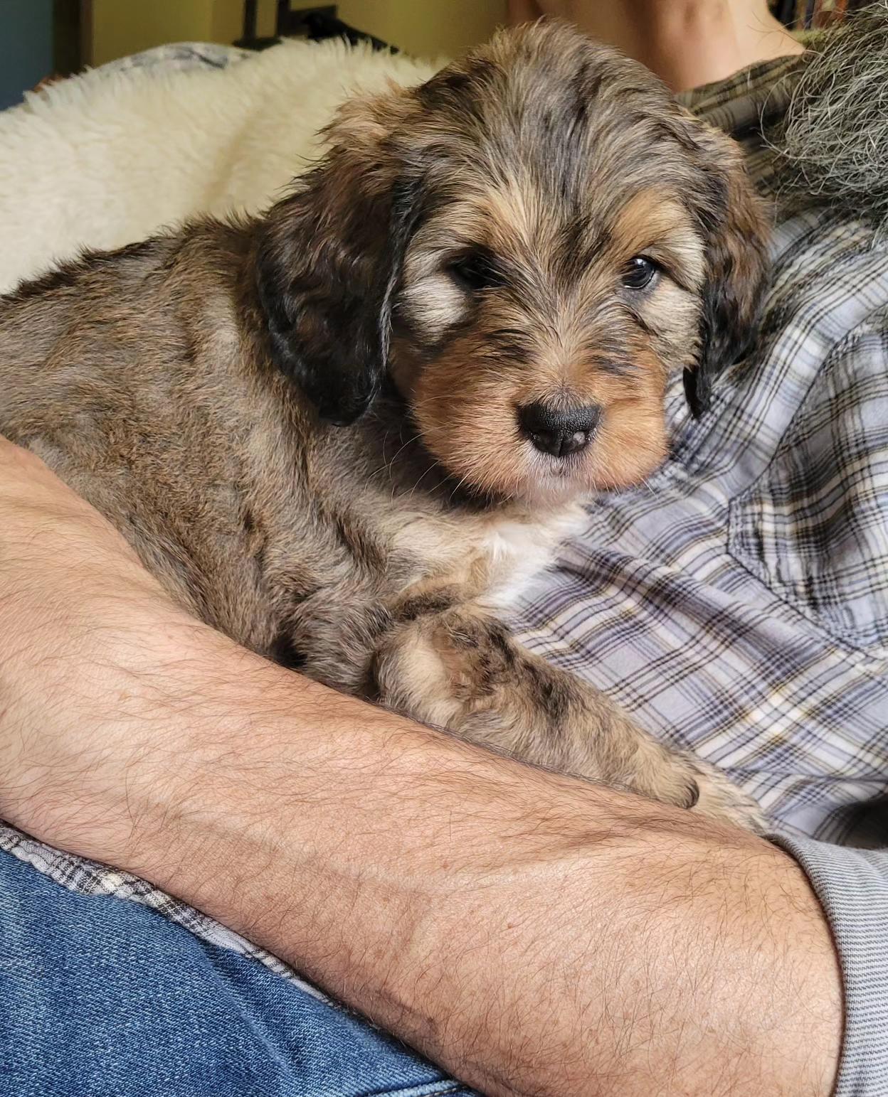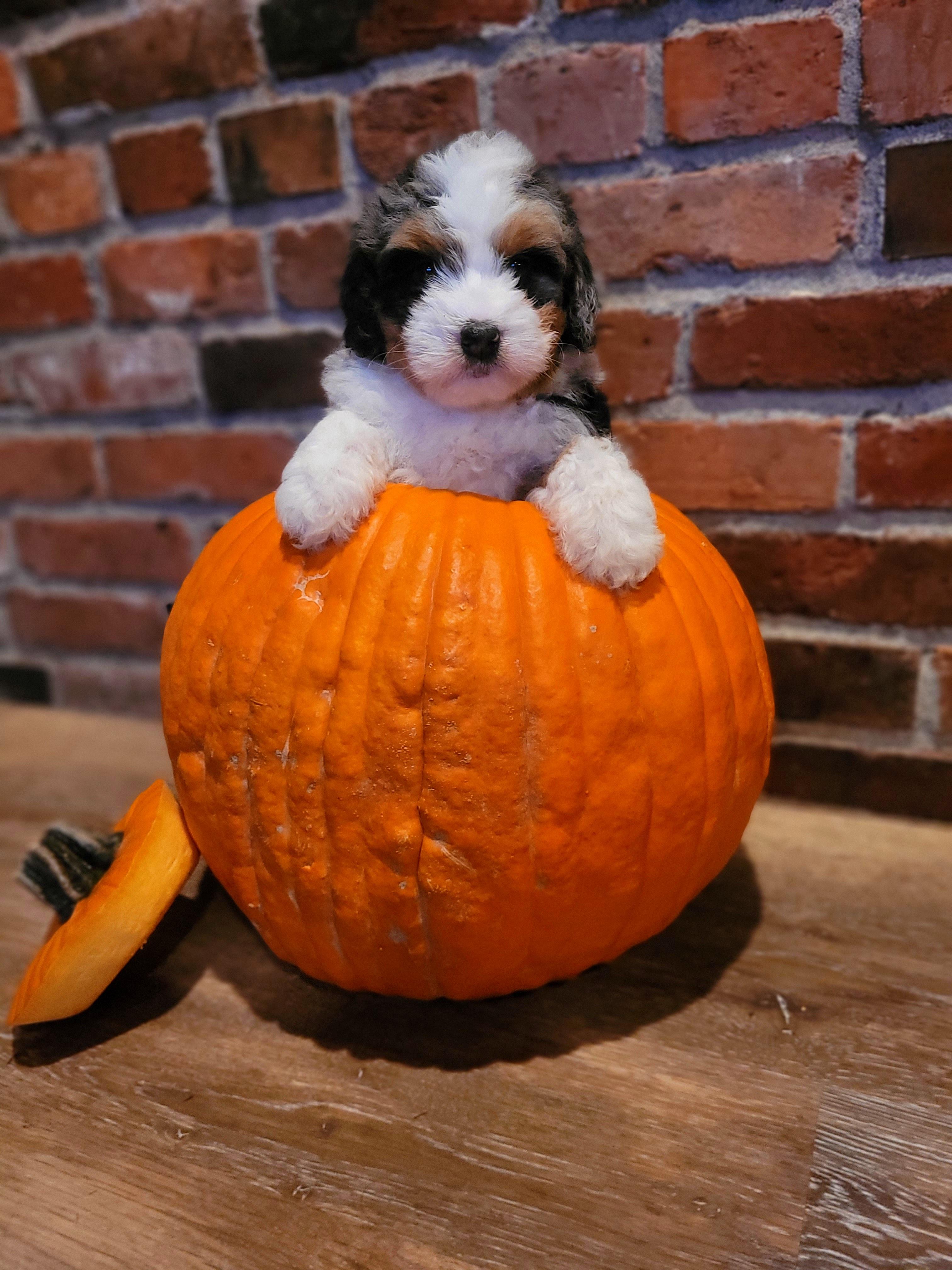 Sawyer is a micro/mini Multigen Bernedoodle. He is confident, affectionate, and very human focused.