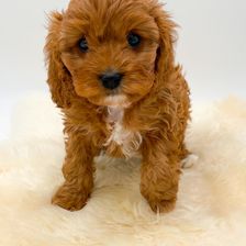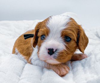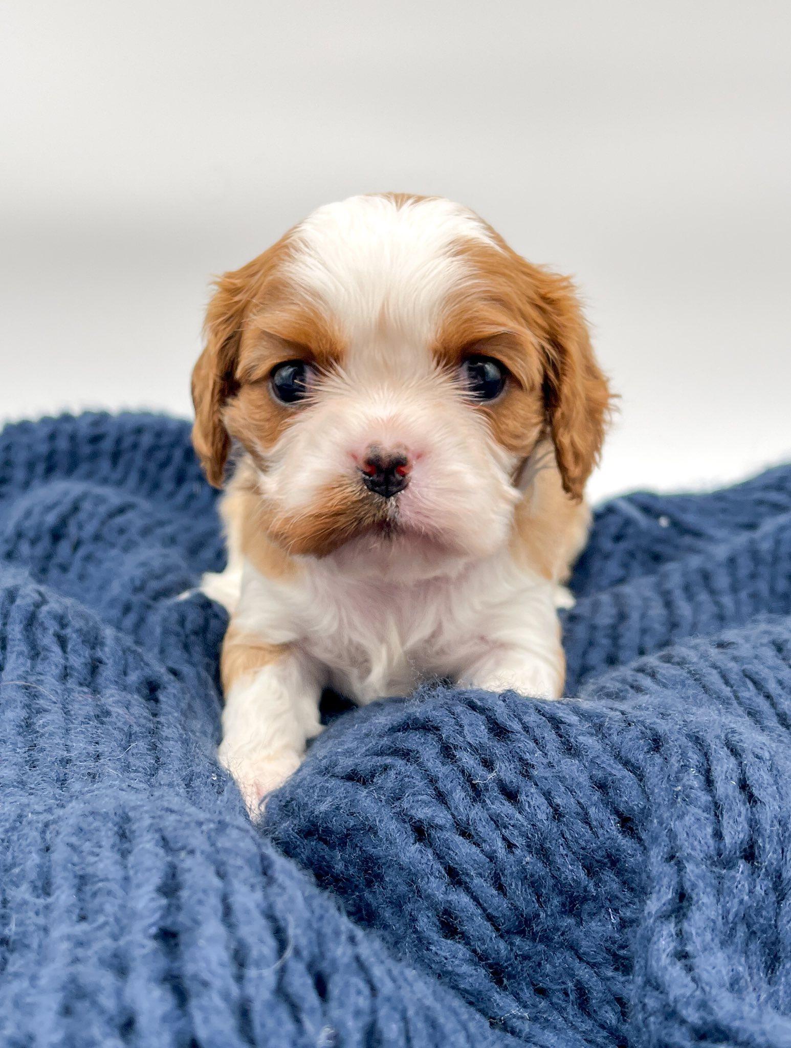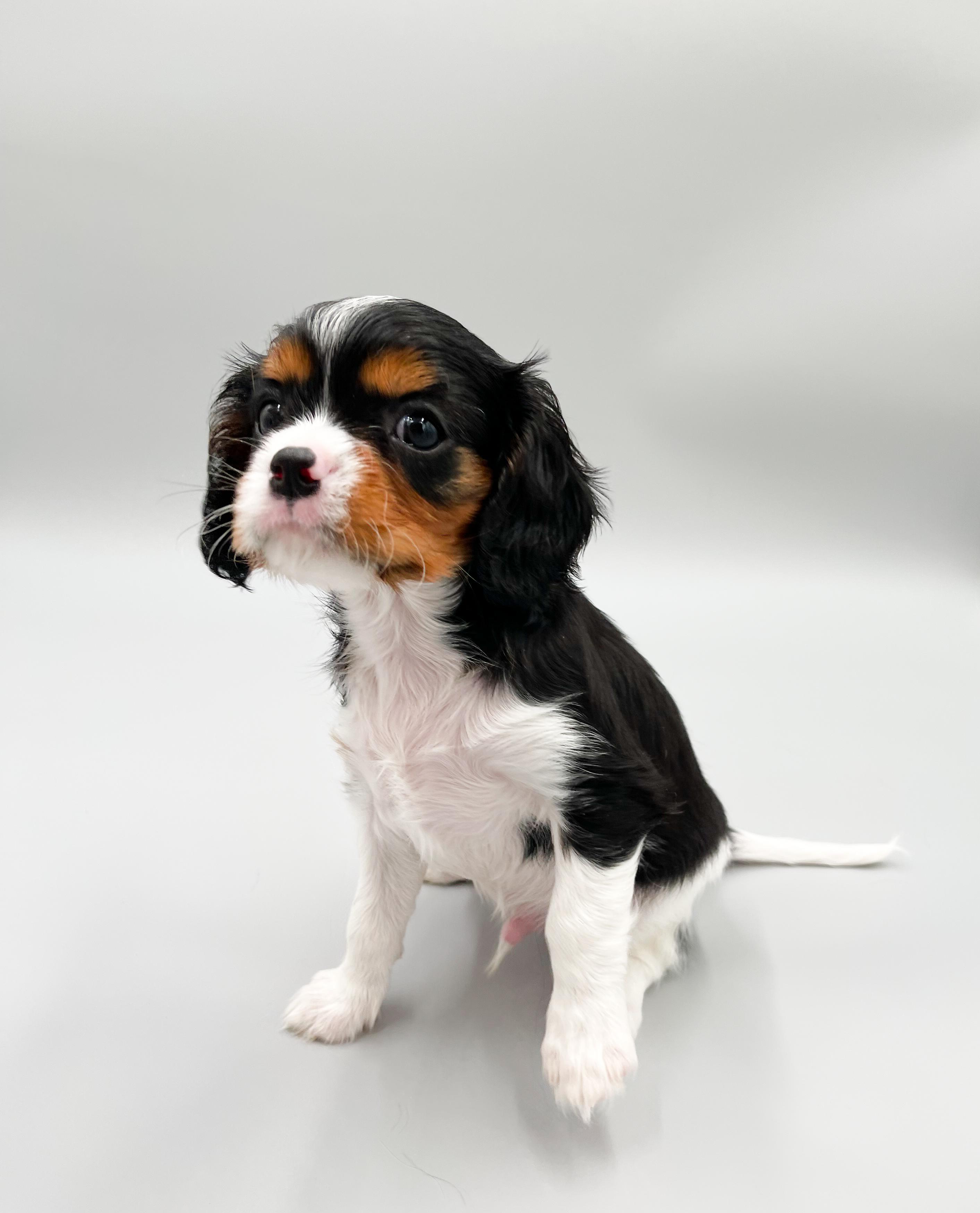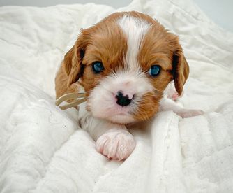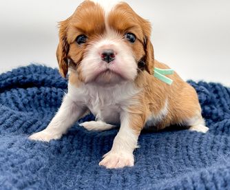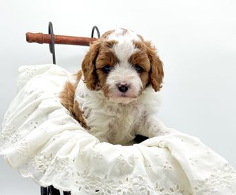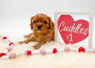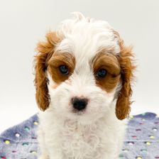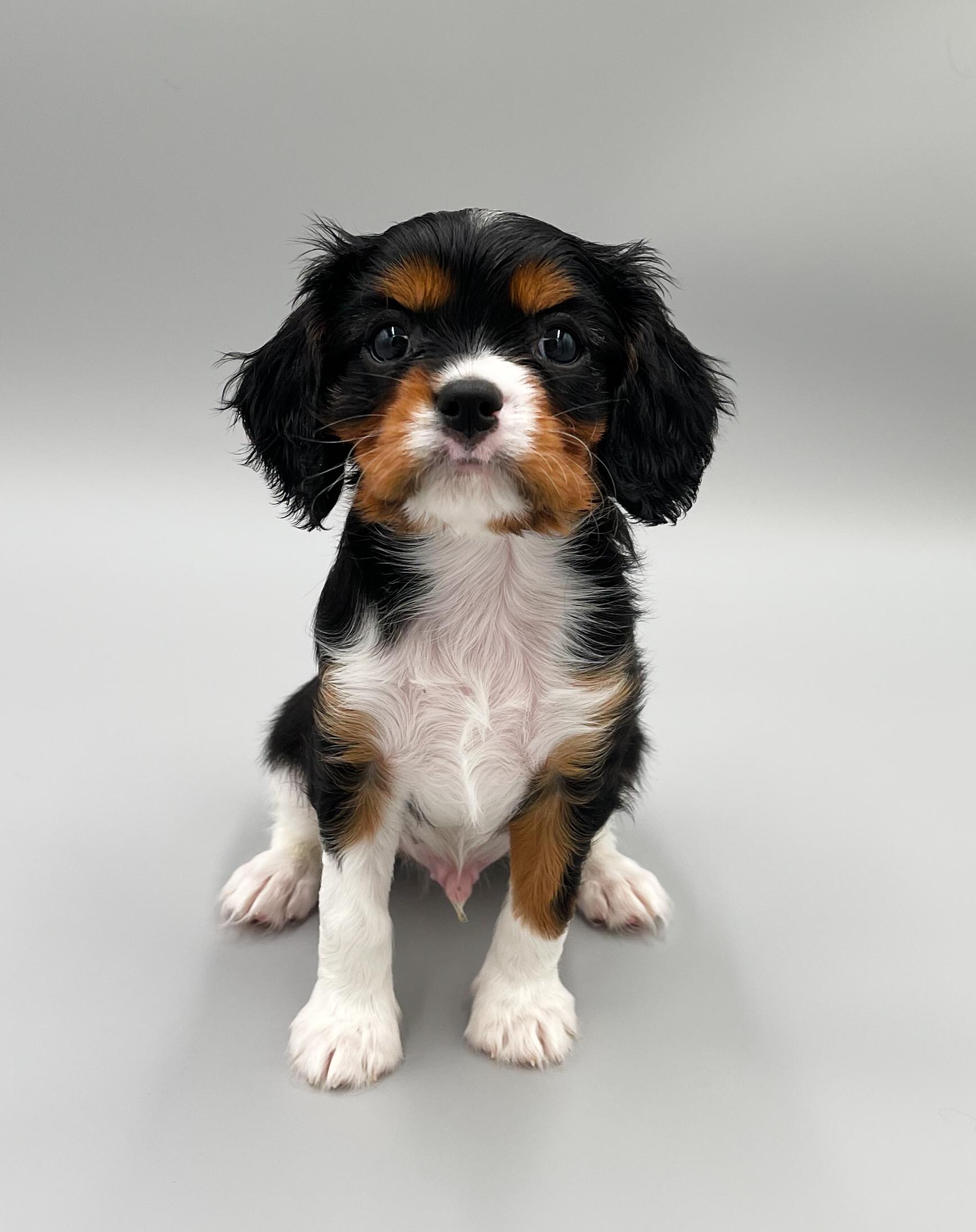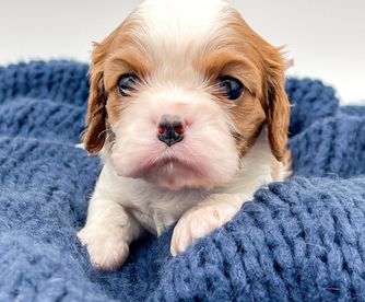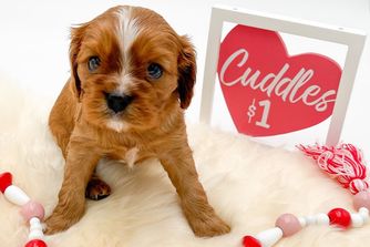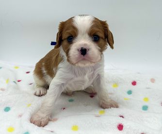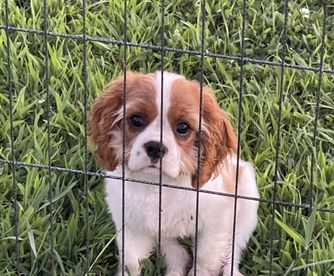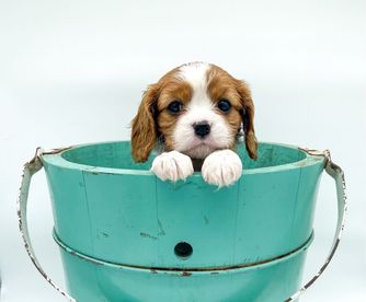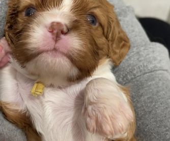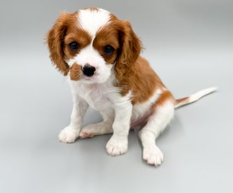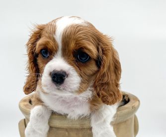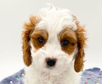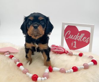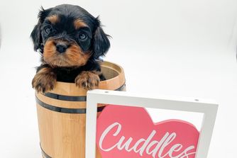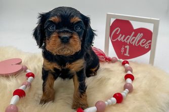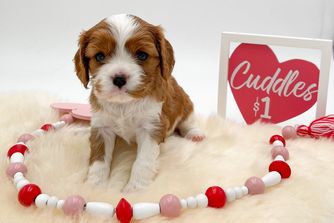Our Cavalier King Charles Spaniel puppies include blenheim, ruby, black and tan, and tri-color. Cavapoo puppies include white and red. Colors will vary depending on the parent dogs.