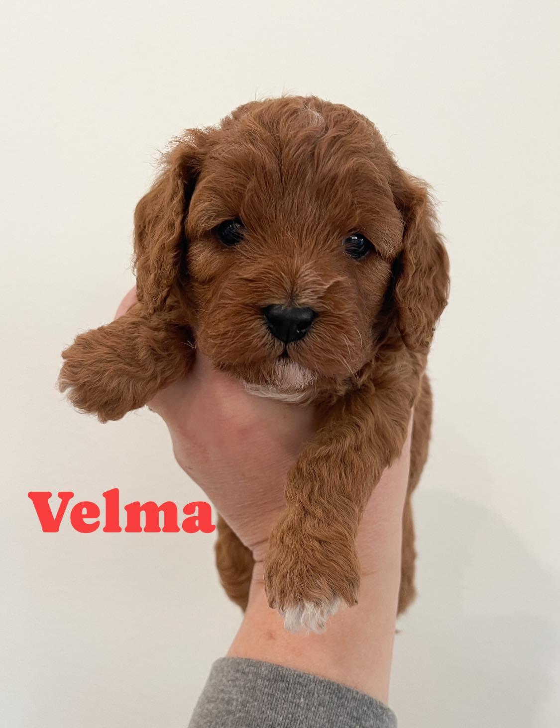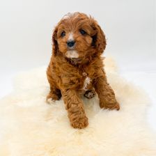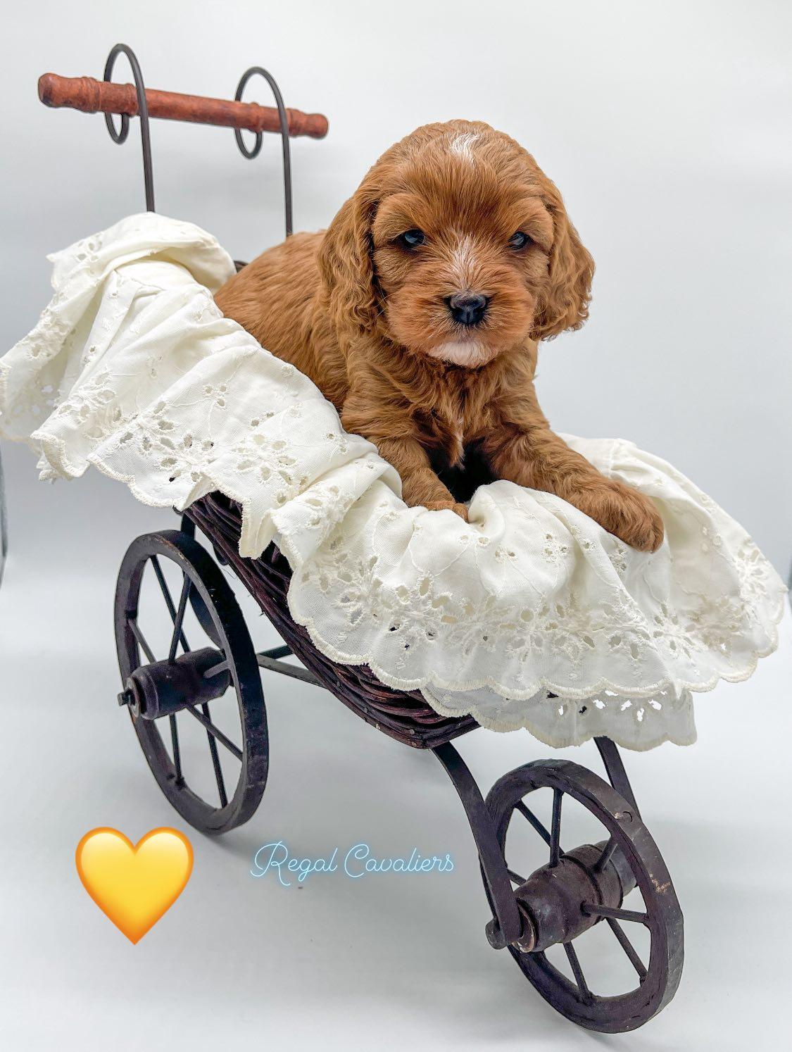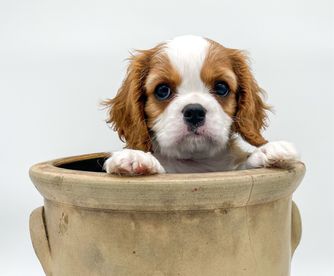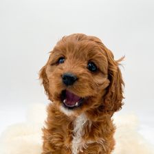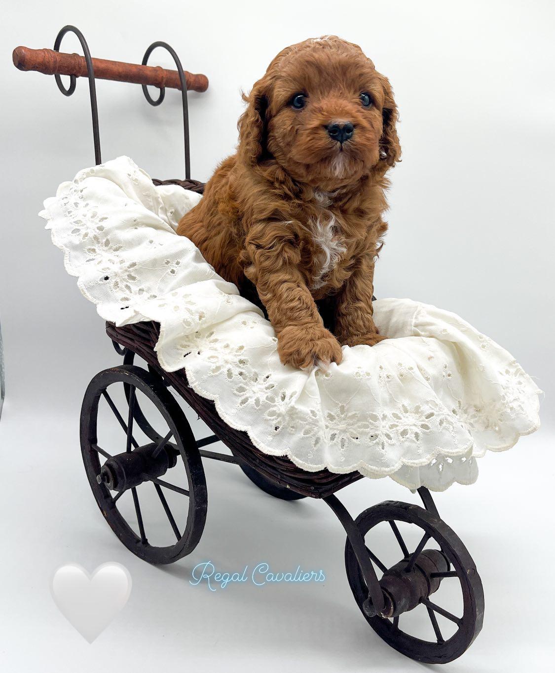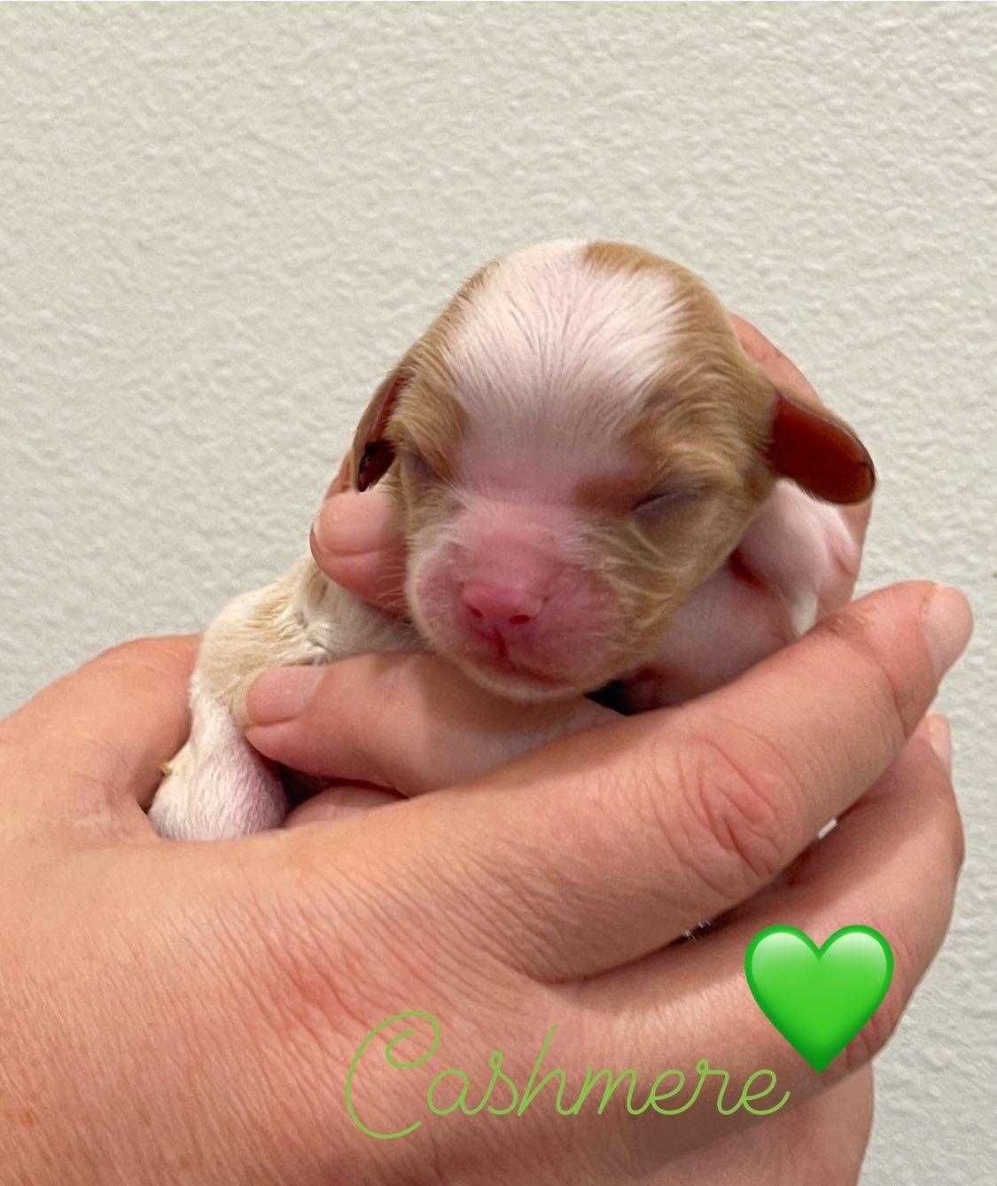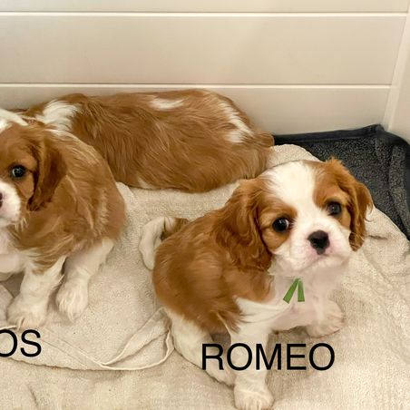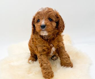 Our Cavalier King Charles Spaniel puppies include blenheim, ruby, black and tan, and tri-color. Cavapoo puppies include white and red. Colors will vary depending on the parent dogs.