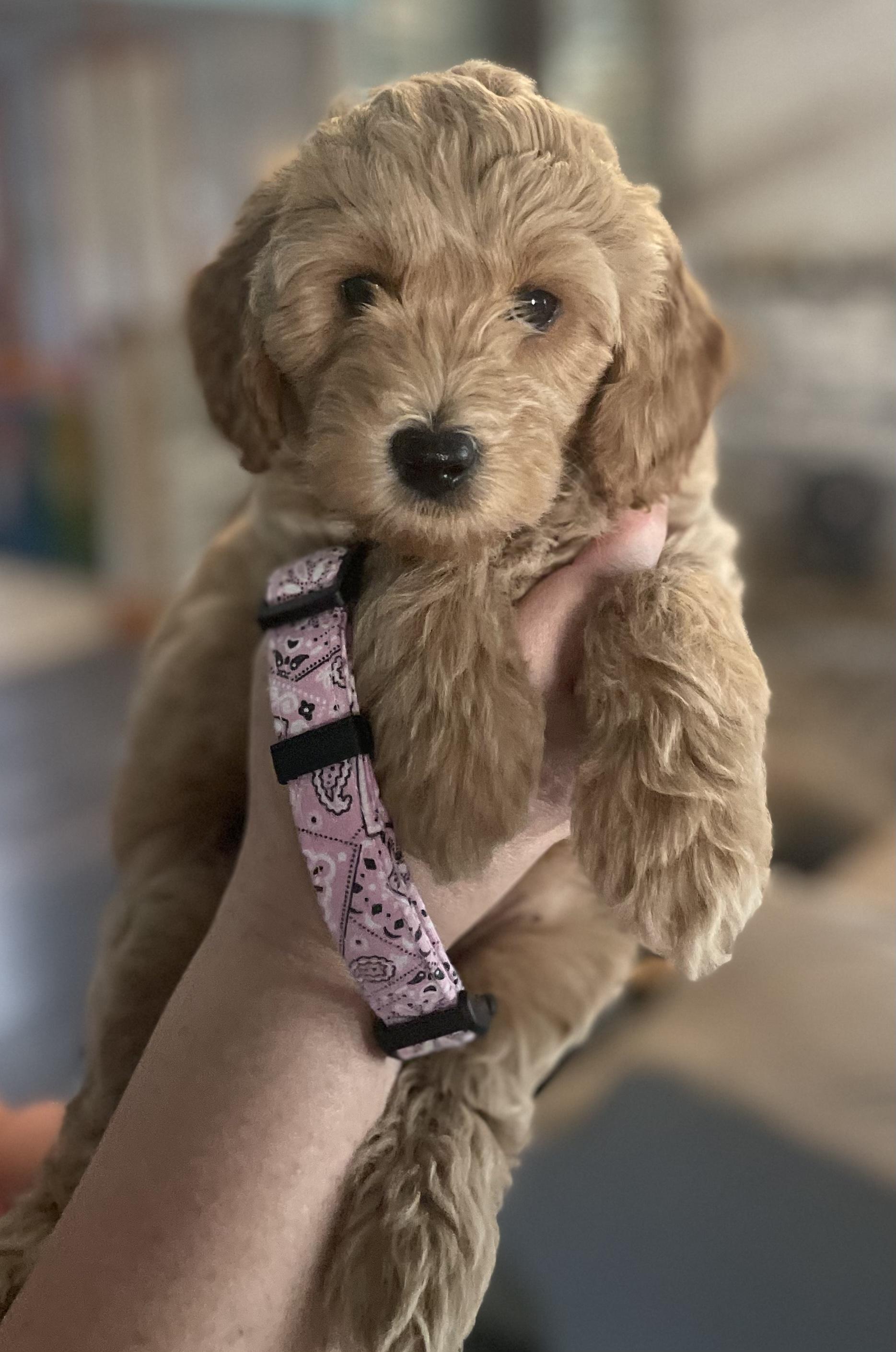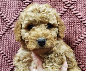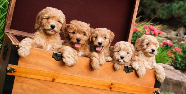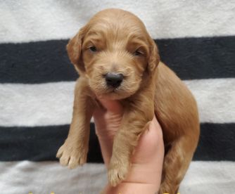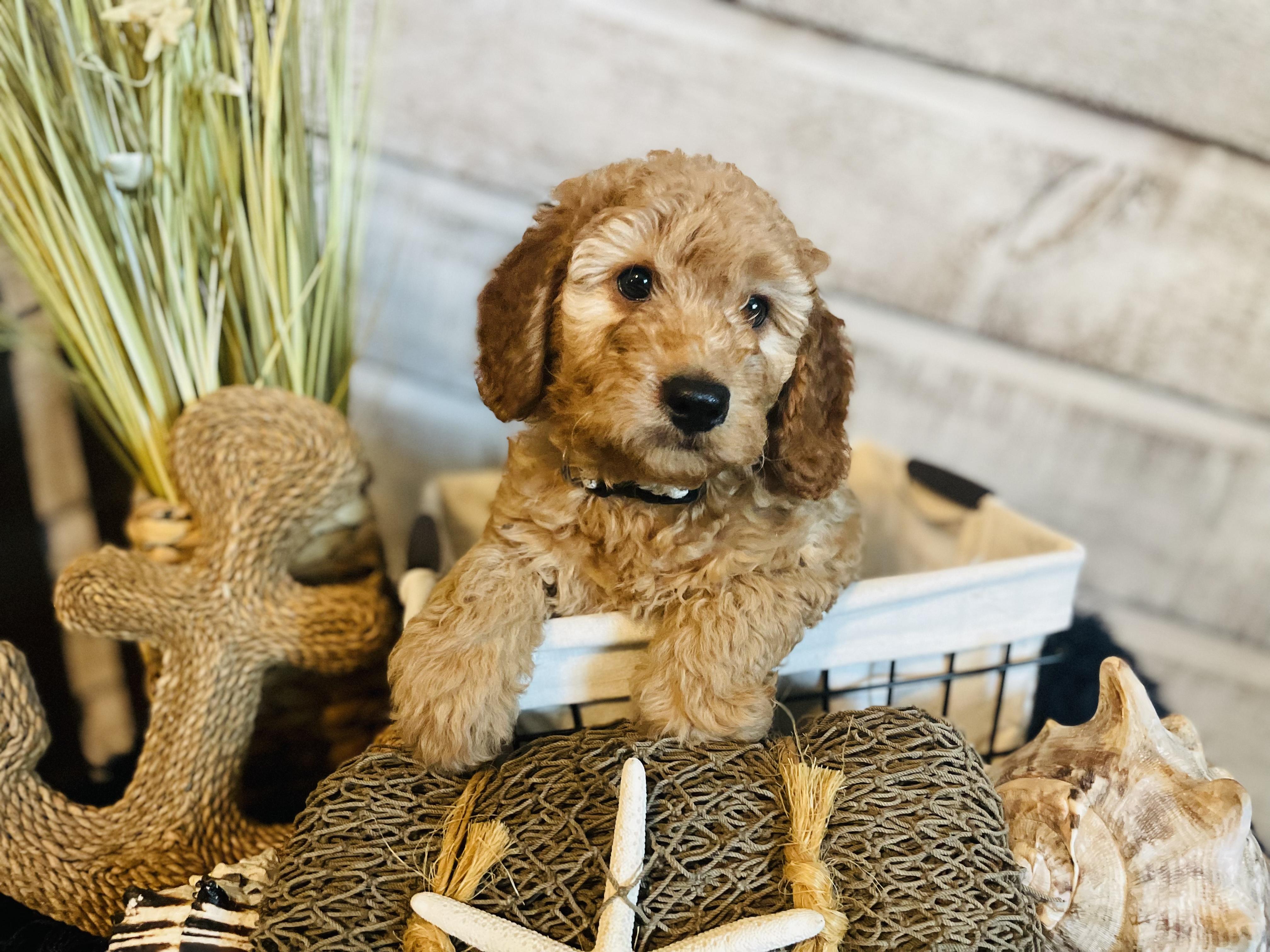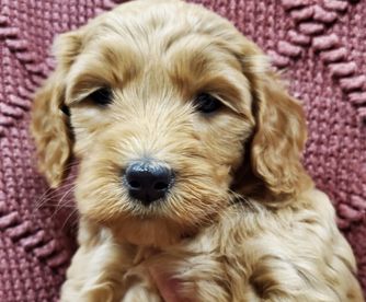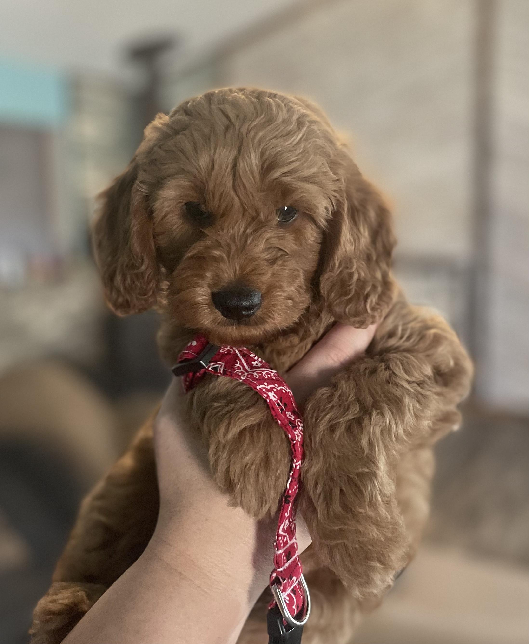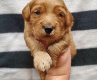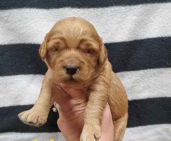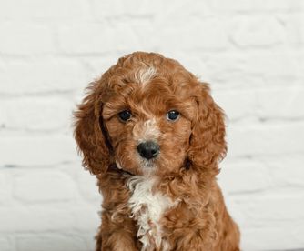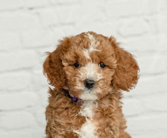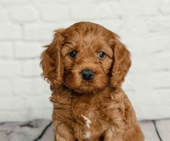 Our Cavapoo puppies include blenheim, apricot, and red. Goldendoodle puppies include cream, apricot, and red. Colors will vary depending on the parent dogs.