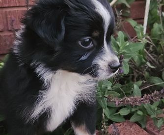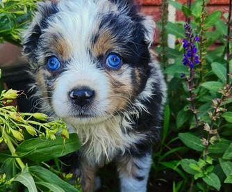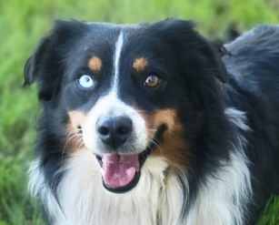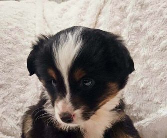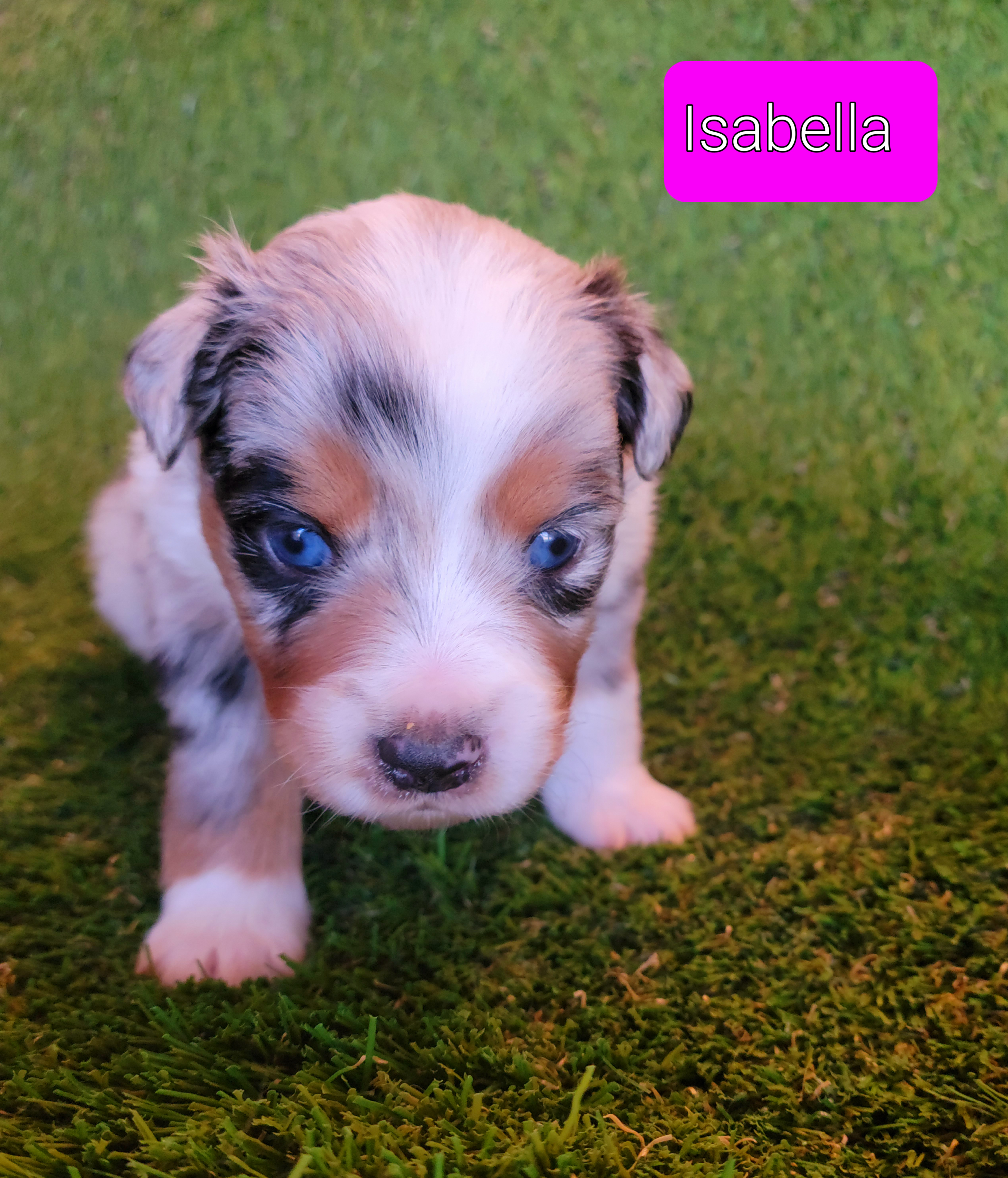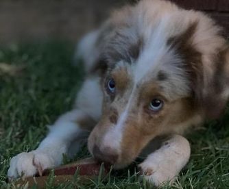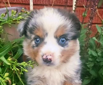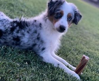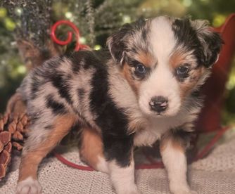 Rue is a stunning blue merle female with rich copper points and a full white collar and breast. She has a wonderful personality. Rue has been incredibly easy to train. She is a medium drive mini Australian Shephard. She hasn't met a person that doesn't adore her.