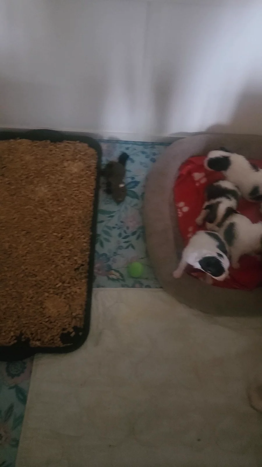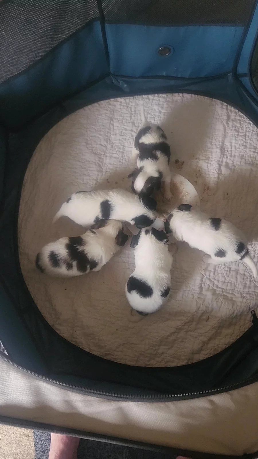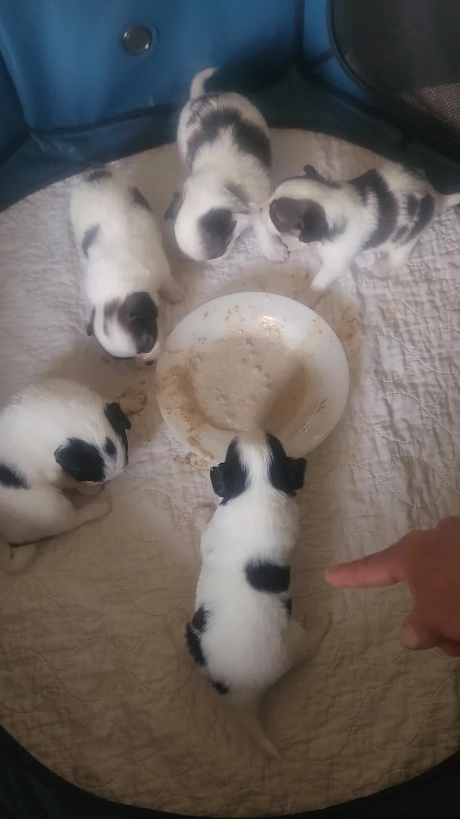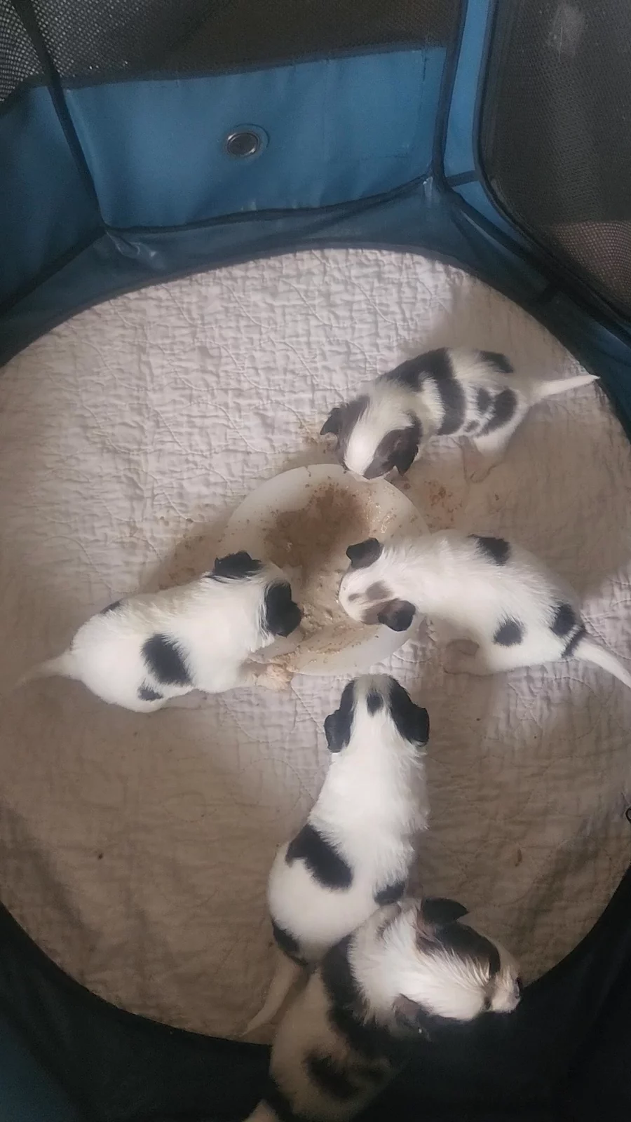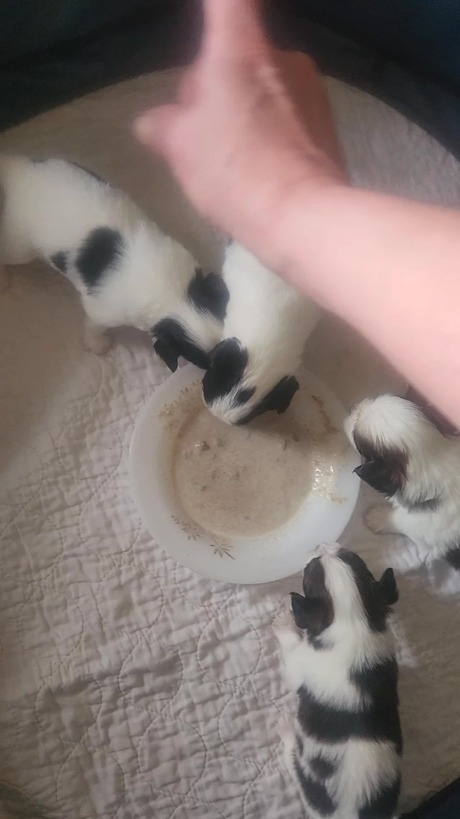 Starting potty tray training and puppy mush. Pet Lac replacement puppy milk with ground puppy food Iam and Science Diet.