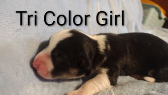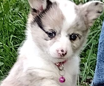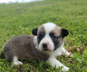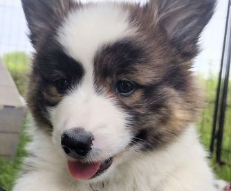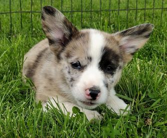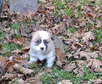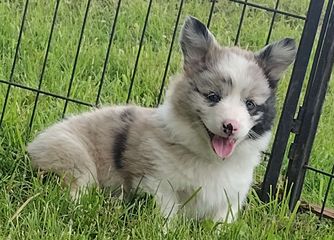 American Corgi puppies are blue merle and white. Colors will vary depending on the parent dogs.