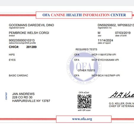 Rex Farm Corgis reports to performing the health tests below on their breeding dogs. Ask your breeder about the tests performed on the parents of your litter. Learn more about health testing for American Corgis.
