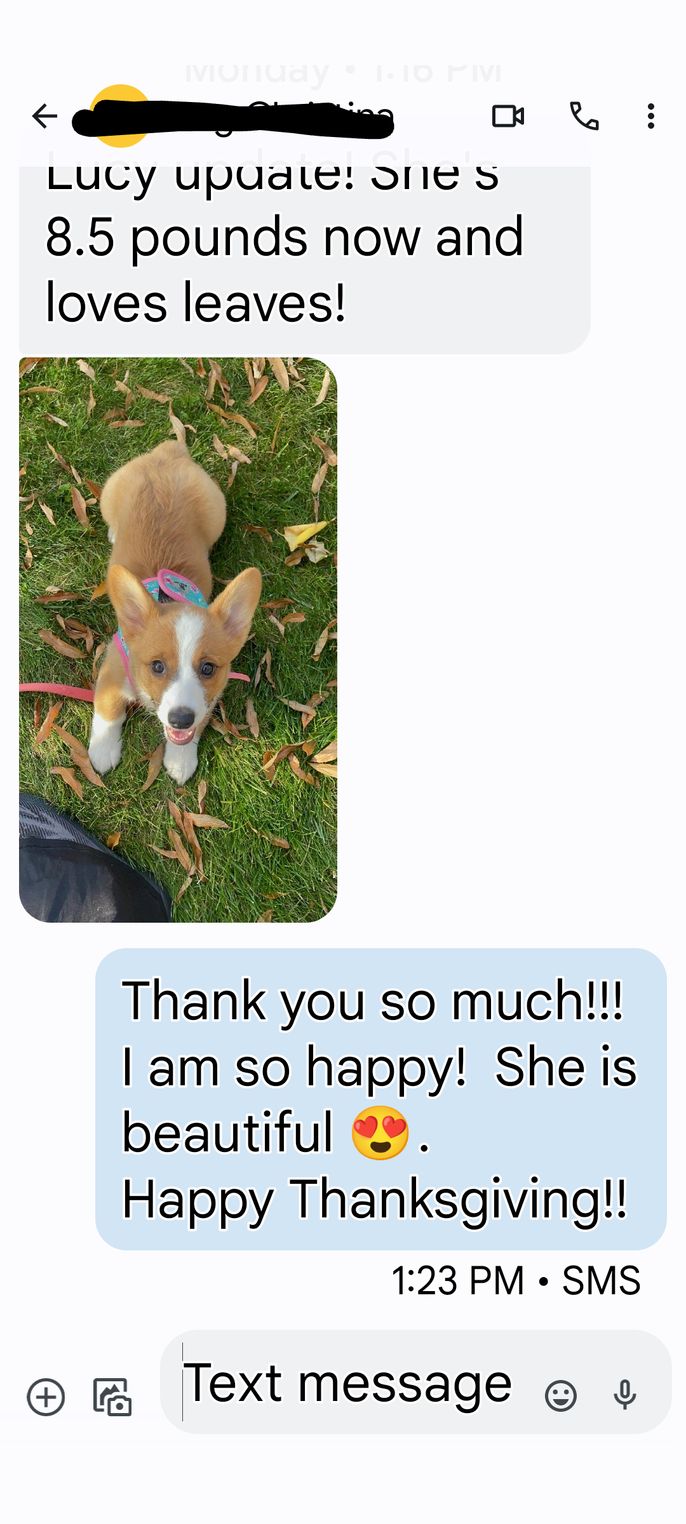 I couldn't be happier with my experience with Jan from Rex Farm Corgis! We received a Pembroke Welsh Corgi from them, and it was clear from the start that this breeder is truly passionate about the breed and the well-being of their dogs. Throughout the process, Jan was incredibly communicative, checking in with me weekly and always taking the time to answer all my questions. I appreciated how transparent they were about the puppies’ upbringing, and I had the opportunity to meet the parents of the litter, Dino and Chloe, who had amazing temperaments. It was evident that both dogs were well-socialized and had wonderful behaviors, which gave me confidence in the breeder’s commitment to raising healthy, happy puppies. One of the things I really appreciated was how Jan shared their strategies for socializing the puppies with different people (of all ages), other dogs, and even other animals. They clearly care about providing a positive, balanced environment for the dogs. My puppy had already been introduced to crate and potty training, which made the transition to our home seamless. She adjusted incredibly quickly, and it was a relief to see how well-prepared she was for her new life with us. It’s clear that Jan truly loves and cares for each of their dogs, and they go above and beyond to ensure their puppies go to great homes. If you’re looking for a responsible, caring breeder who’s genuinely dedicated to the Corgi breed, I highly recommend Jan!