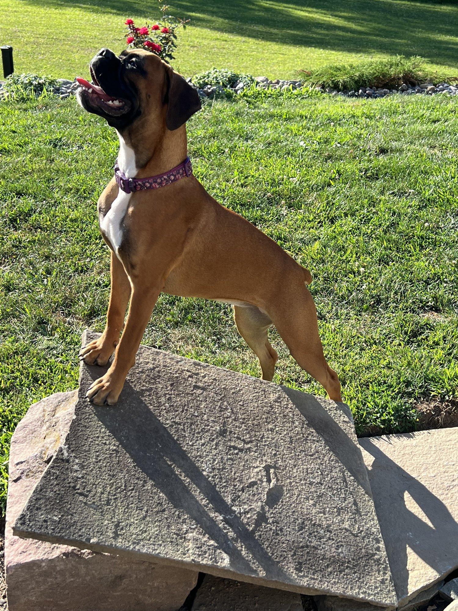Daisy is a female Boxer. Carefully selected as a great representative of her breed, Nicole decided to make her part of their program. Nicole has passed Good Dog’s screening process, which involved a review of their breeding practices, environment, and the mental and physical health of their dogs.