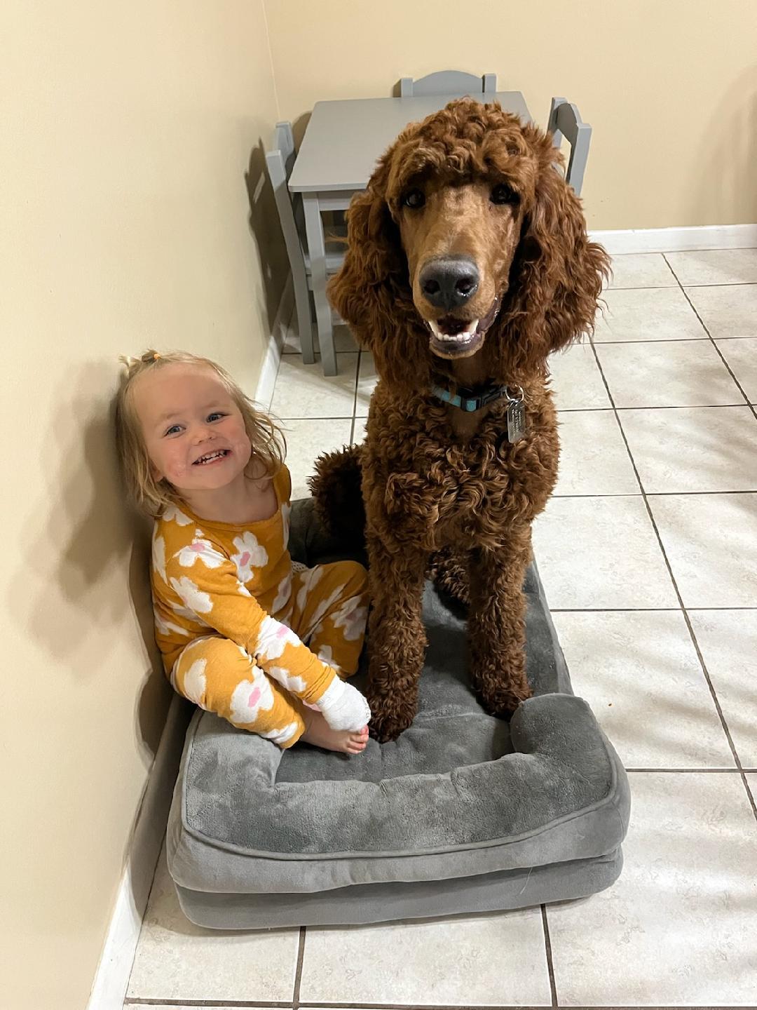 Lilly is a beautiful red standard poodle registered with the AKC. She has cleared her health tests for hips (Penn hip), elbows, eyes, cardiac, genetic (poodle panel) as well as has a full color panel (all results below). She stands 22.5 inches tall at the shoulder and weighs 50 lbs. Both her sire and dam are AKC registered red standard poodles who have a record of cleared health tests and excellent lines. She just turned 6 years old (August 2023) and is as healthy and beautiful as ever, and has continued to hold her red color (see current photo below). She has had 3 beautiful litters. Her fourth litter will be her last as she is our family dog/companion first. We have never loved a dog more. She is the reason we decided to breed an occasional litter, so others can also enjoy the companionship of a poodle in their life.