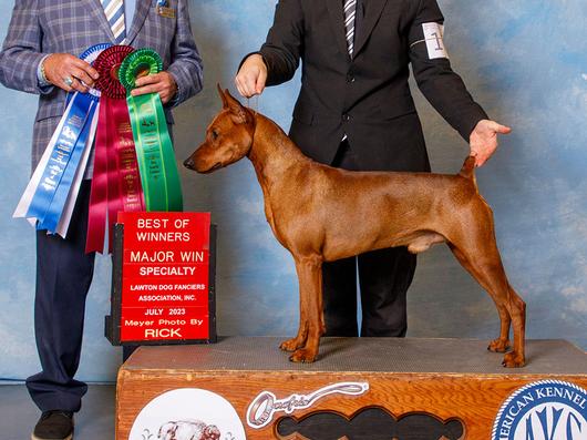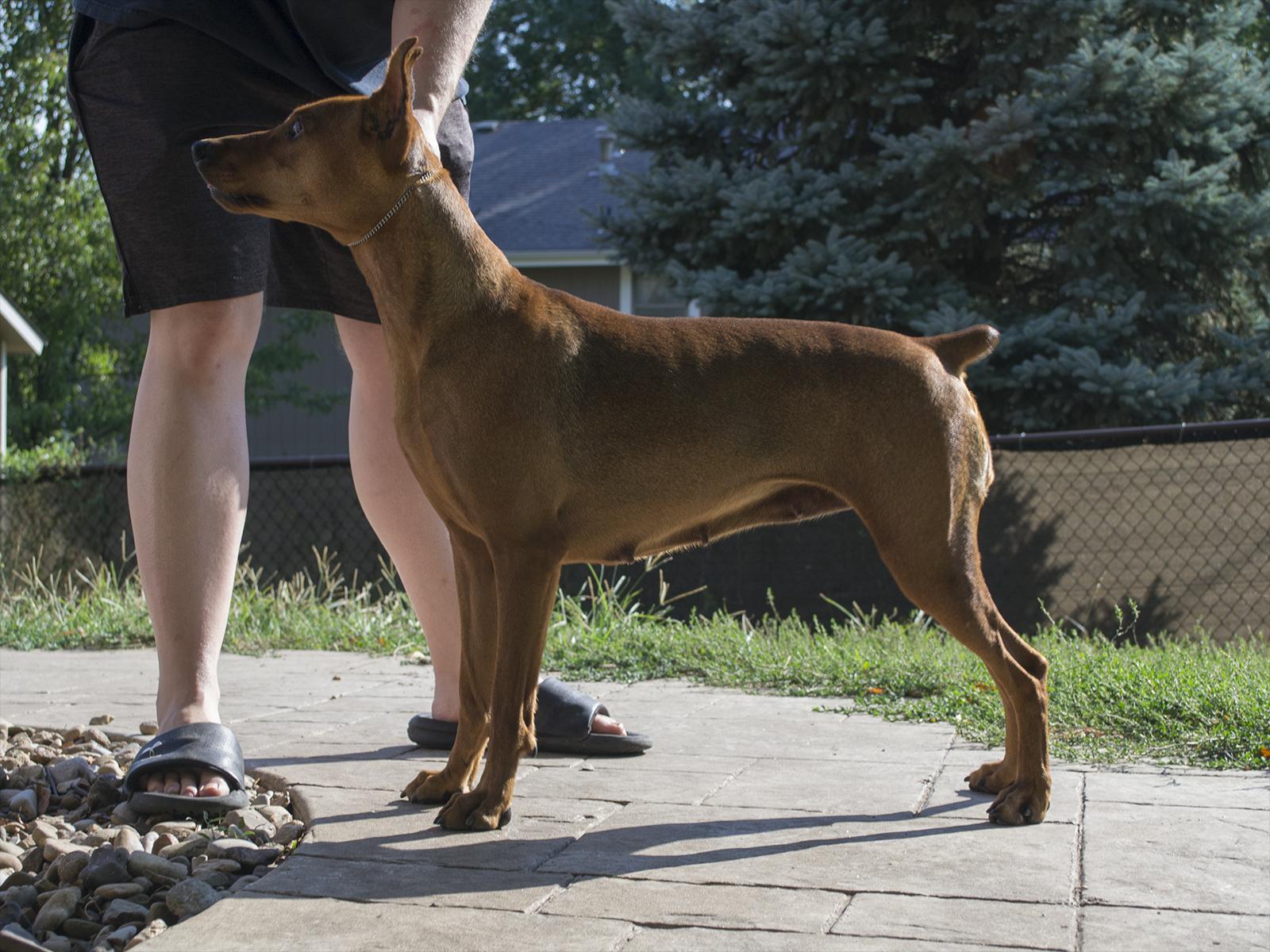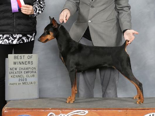 We purchased our first German Pinscher in early 2008 as a family pet. In 2011 we got our first show dog, an AKC champion female, and we had a lot of fun and learned a lot about dog shows and German Pinschers as we showed her to her grand championship. It wasn't until 2016, after showing several other German Pinschers to their championships & grand championships, that we bred our first litter.