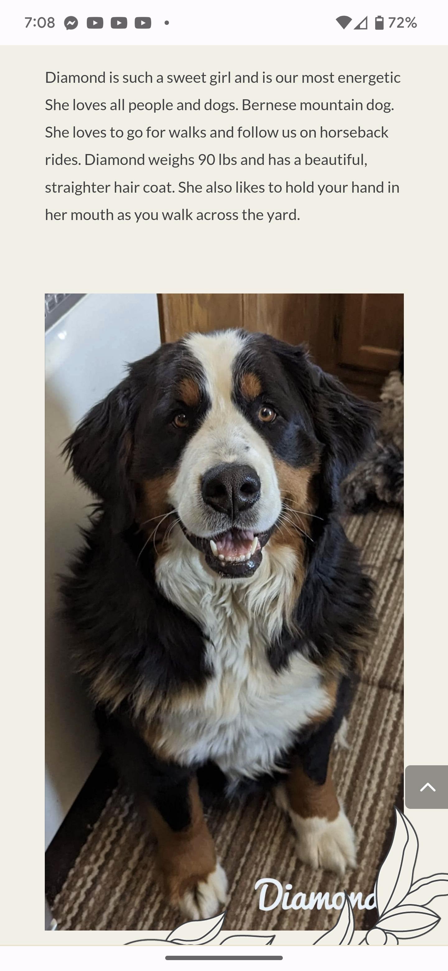 Diamond is a female Bernese Mountain Dog. Carefully selected as a great representative of her breed, Heather decided to make her part of their program. Heather has passed Good Dog’s screening process, which involved a review of their breeding practices, environment, and the mental and physical health of their dogs.