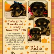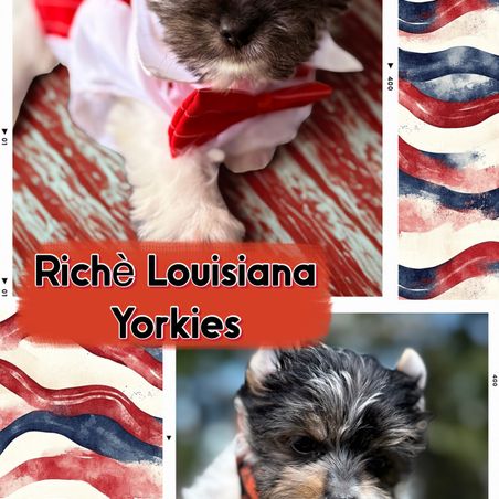 I'm Melissa R., the breeder behind Riche’ Louisiana Yorkies located in Tangipahoa County, LA. We love our dogs and what we do, and we strive to make each puppy a great contribution to his or her forever home. Our dogs are part of our family first and foremost. We complete various health tests prior to breeding and we breed for quality, not quantity.