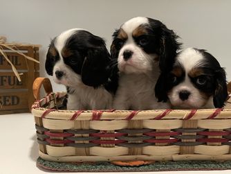 “Thank you for your interest in Ridgefield Cavaliers. At present, we have 4 male puppies available (1 Blenheim and 3 Tri's). We begin the housebreaking process by crate training the litter when they are 8 weeks old, and we place puppies at 10 weeks of age. Please follow us on Instagram at Ridgefieldcavaliers or fill out a puppy application on our website at ridgefieldcavaliers.com. If you have any additional questions or would like to chat about our breeding program, please call me at 773 456 6616.”