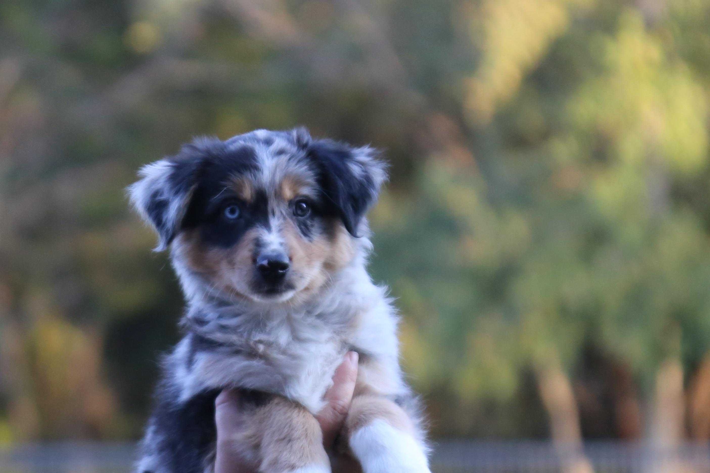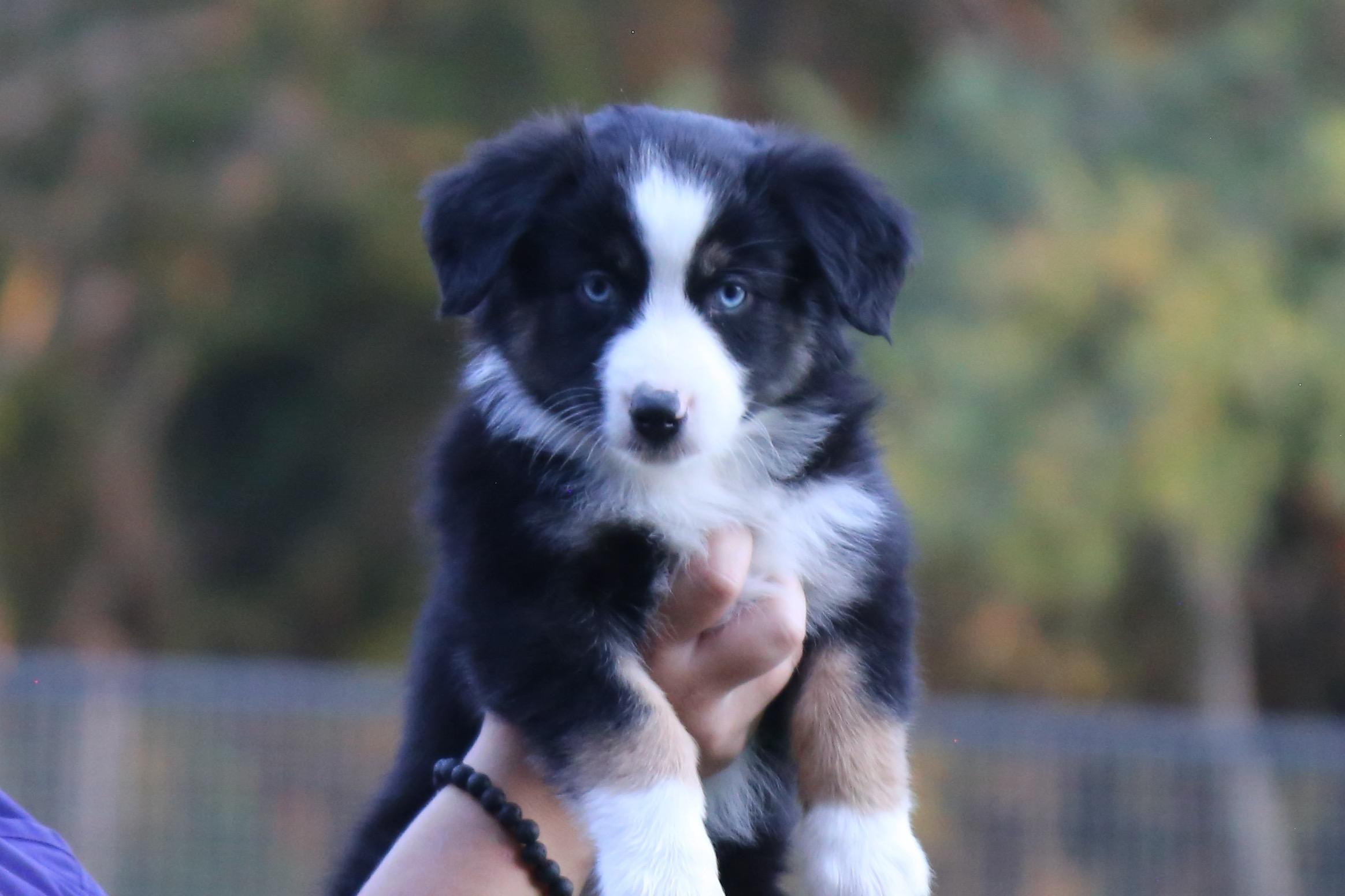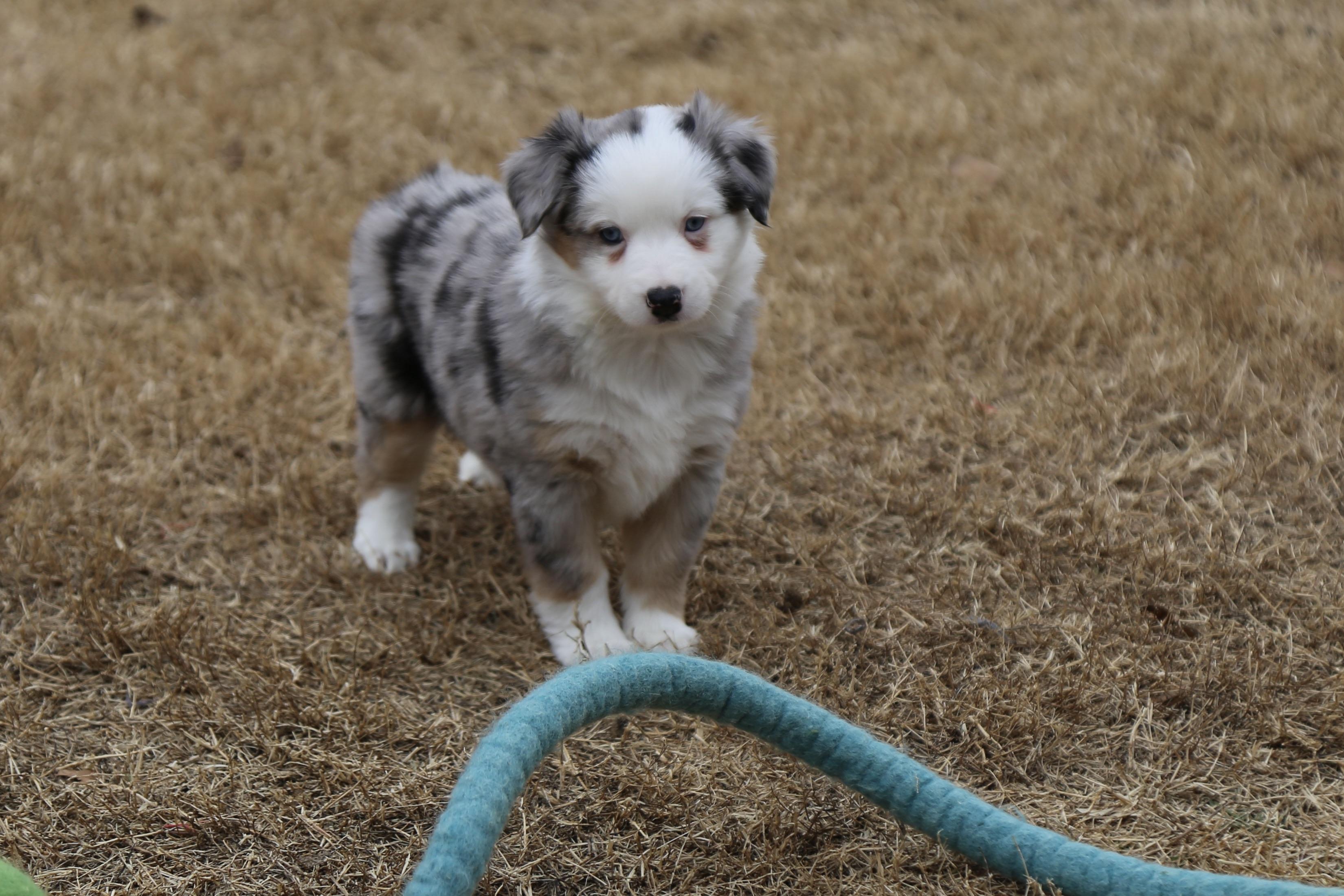 Our Miniature Australian Shepherd puppies include blue merle, black tri, red tri, and red merle. Australian Shepherd puppies include red & white, black & white, red merle, blue merle, black tri-color, and red tri-color. Colors will vary depending on the parent dogs.