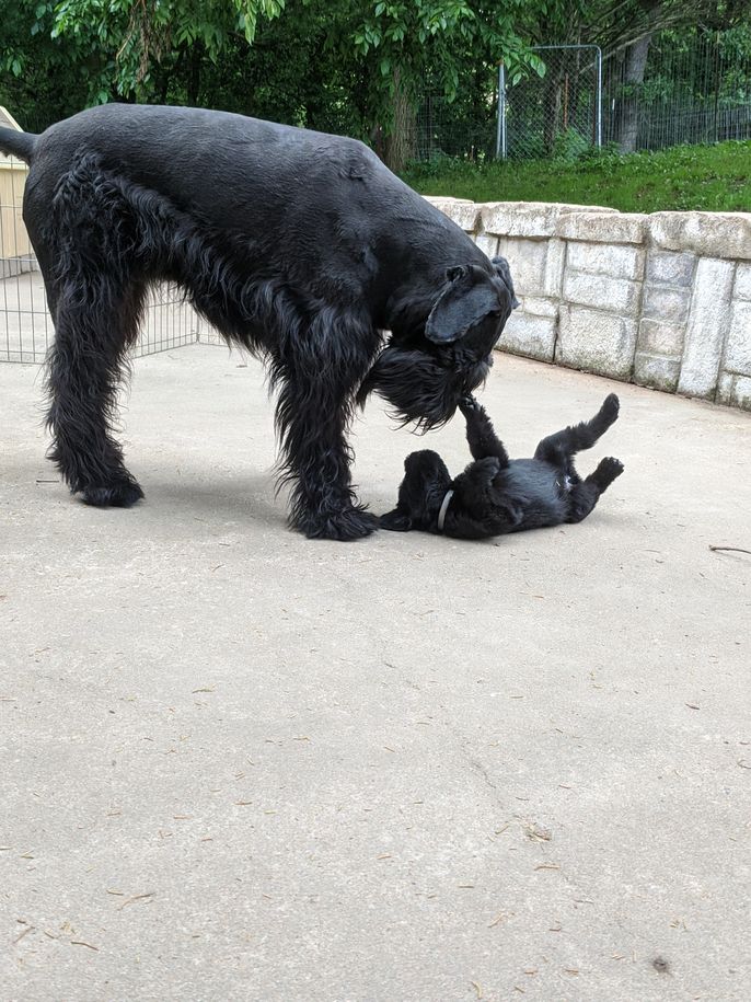 Monkey is a female Giant Schnauzer. Carefully selected as a great representative of her breed, Camille decided to make her part of their program. Camille has passed Good Dog’s screening process, which involved a review of their breeding practices, environment, and the mental and physical health of their dogs.