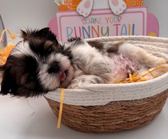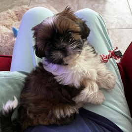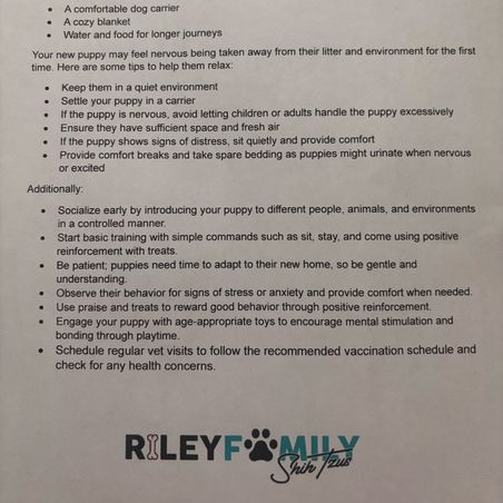 My husband and I have only had Shih Tzus over the past 42 years. We love the breed and we were delighted when we found the Riley Family Shih Tzu breeders on the internet via Good Dog. From our initial contact, Tiffany was incredibly responsive and answered all our questions thoroughly. When visited their home to meet the puppies, we were impressed by the clean environment in their home where the puppies were kept. The male puppy we adopted is in excellent health, with all necessary vaccinations up to date, microchipping done, and DNA documentation provided. He had also been paper-trained. Tiffany provided detailed health records and even recommended their local vet for follow-up care to keep our little guy on schedule. Also included in our take-home bag was a sample and list of the food, vitamins, and treats they had been consuming. Our male Shih Tzu has a wonderful playful temperament, is well-socialized, and has adapted quickly to our home. Riley Family Shih Tzu Breeder is very knowledgeable and provided valuable advice on training and care. While we were waiting for our pickup date, we were delighted that Tiffany sent us photos and videos and updates of our little pup along with his siblings. She has been available for all of our questions we have had even after bringing our puppy home. We are delighted with our healthy and well-socialized puppy and the continuing support proved by Tiffany. We are very comfortable recommending Riley Family Breeders to anyone looking for a Shih Tzu. Thank you.