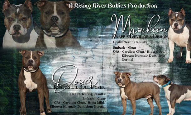 Rising River Bullies reports to performing the health tests below on their breeding dogs. Ask your breeder about the tests performed on the parents of your litter. Learn more about health testing for American Bullies.