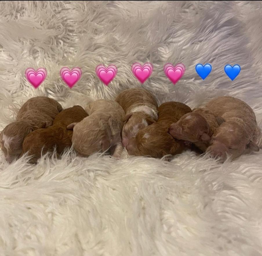 Our Goldendoodle puppies include cream, apricot, red, and parti. Poodle puppies include black, brown, red, parti, and phantom. Colors will vary depending on the parent dogs.