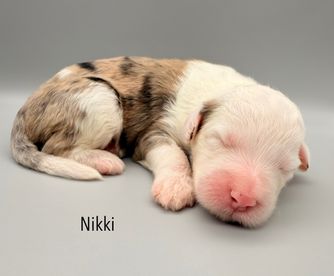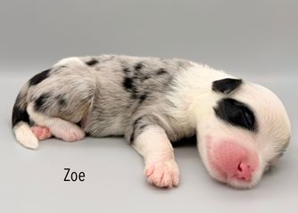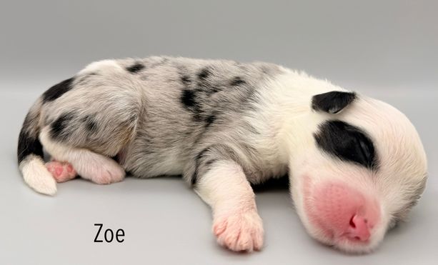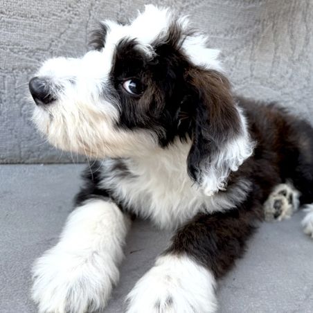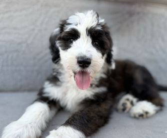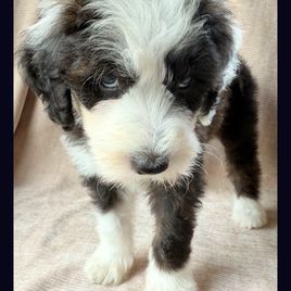 Our Sheepadoodle puppies include merle, blue merle and white, and black and white. Colors will vary depending on the parent dogs.