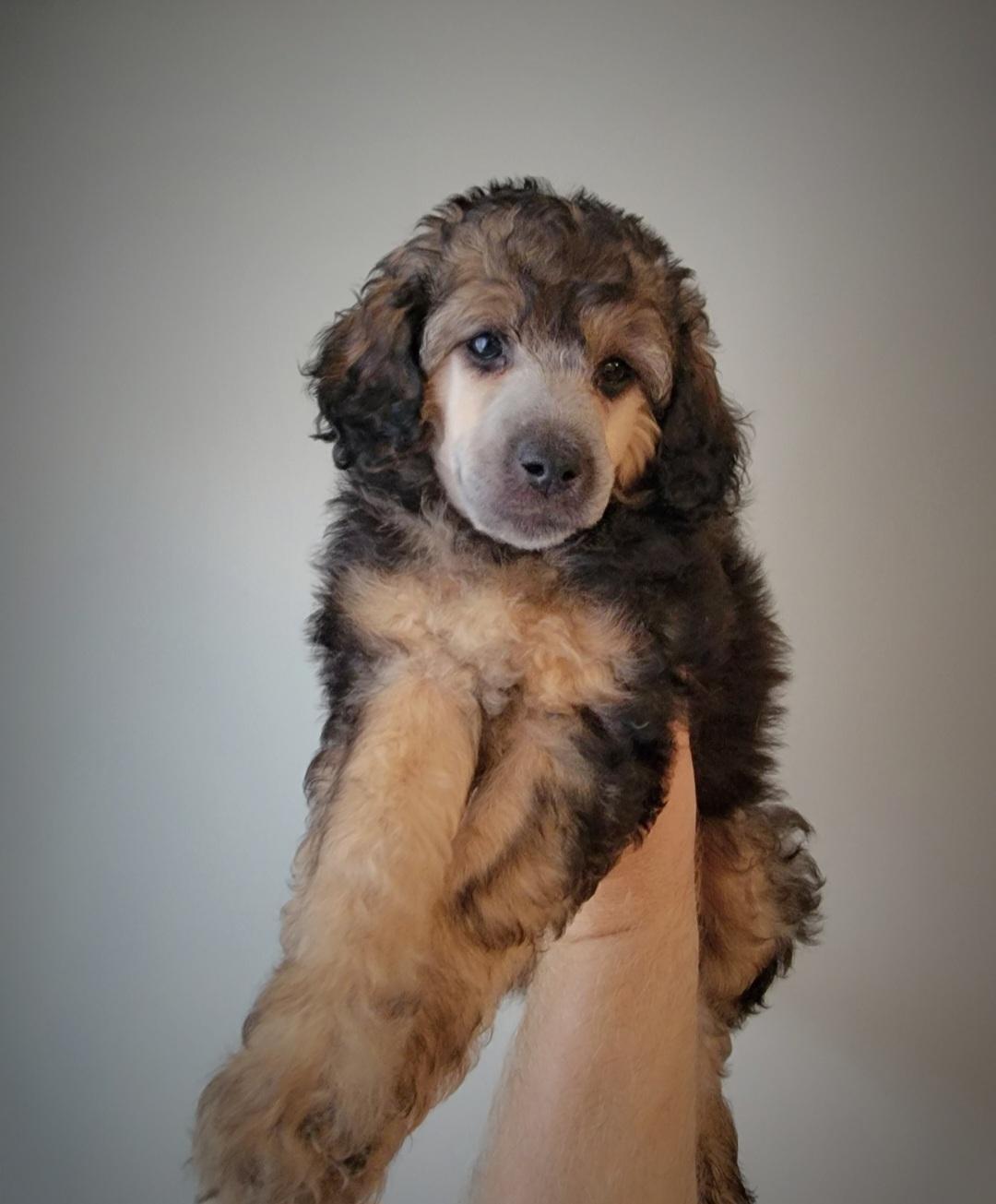 Aspen is fun loving boy who's people originated and loves playing with other dogs. Hes a phantom colored poodle that's about 21 lbs.