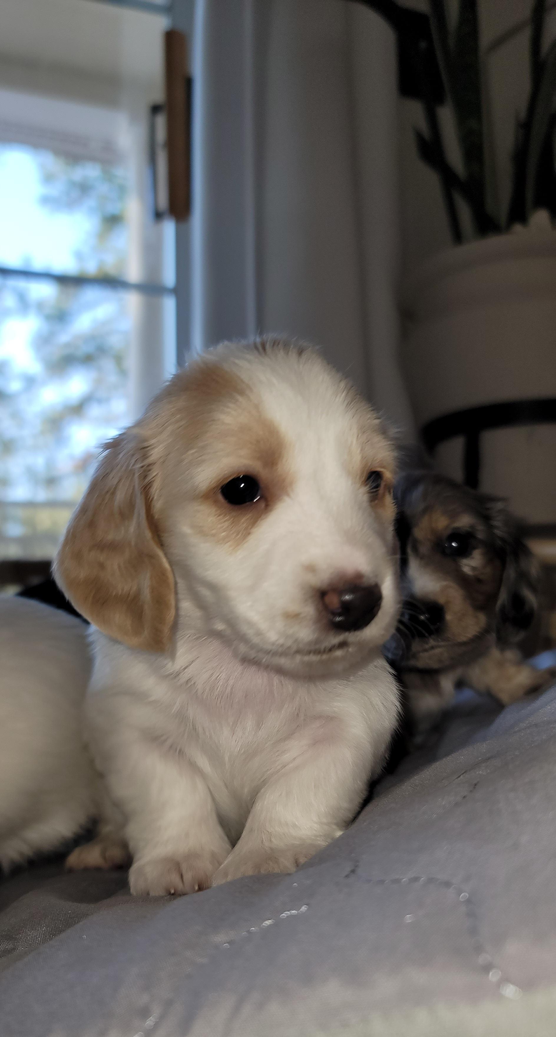 River is a shaded cream LH dachshund that is loyal to his family. He gives the best hugs and passes that trait down to his kids. He is loved by all the other animals and humans in the house as he was born with a calm loving demeanor.