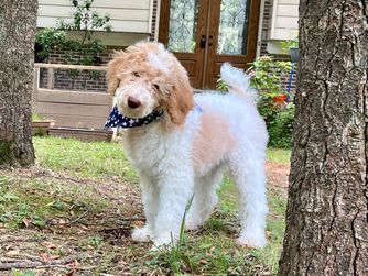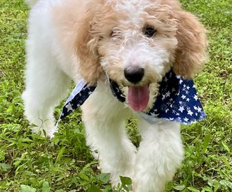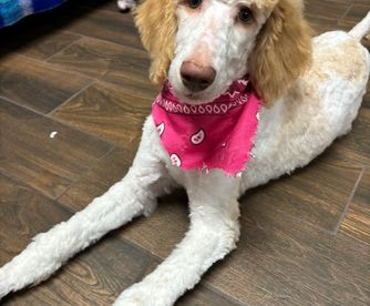 ARCHIE (Sire)—Parti Poodle apricot/white. Archie is four years old and a working service dog for autistic children. His superior temperament and instinctive and intuitive demeanor make him an excellent companion and service animal. Nearing 60 lbs, he is truly our gentle giant.