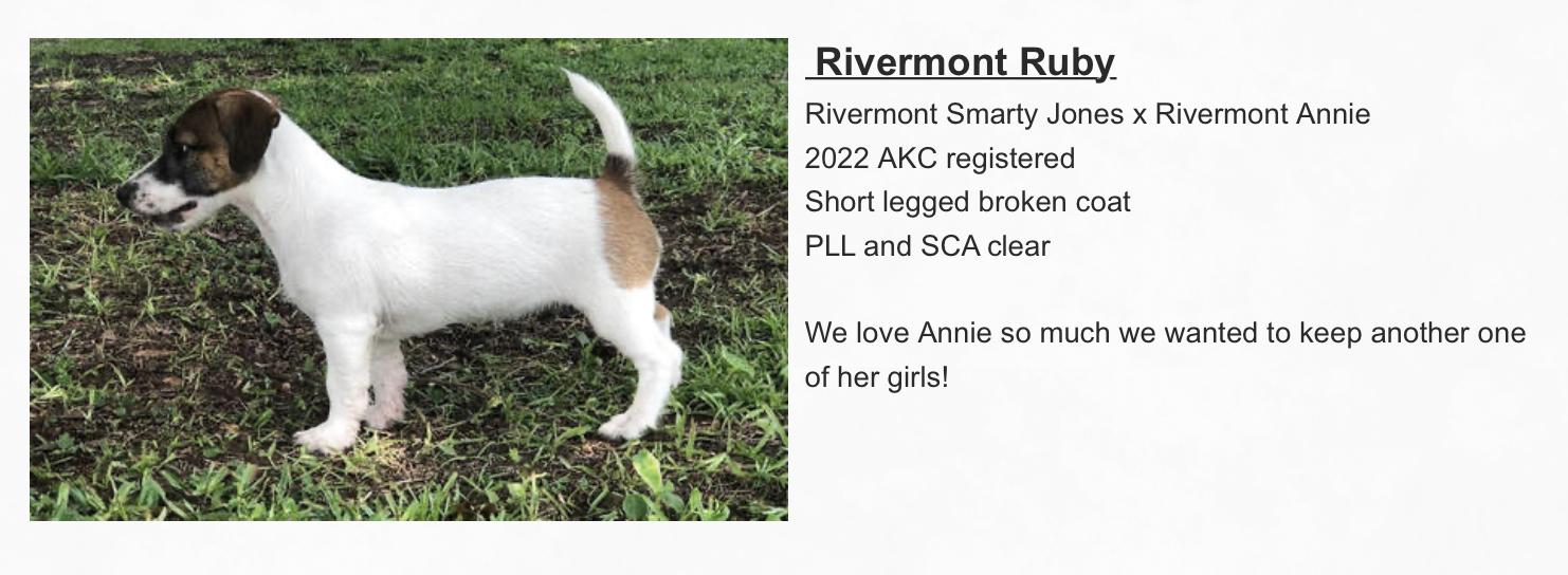 I'm Ashley G., the breeder behind Rivermont Farm located in Ocala, FL. I began raising Jack Russell’s in the 1990’s and most recently began raising corgis as well. Our dogs are health tested and we strive to breed quality, healthy dogs with family friendly temperaments. Our dogs are raised on our 20 acre horse farm.