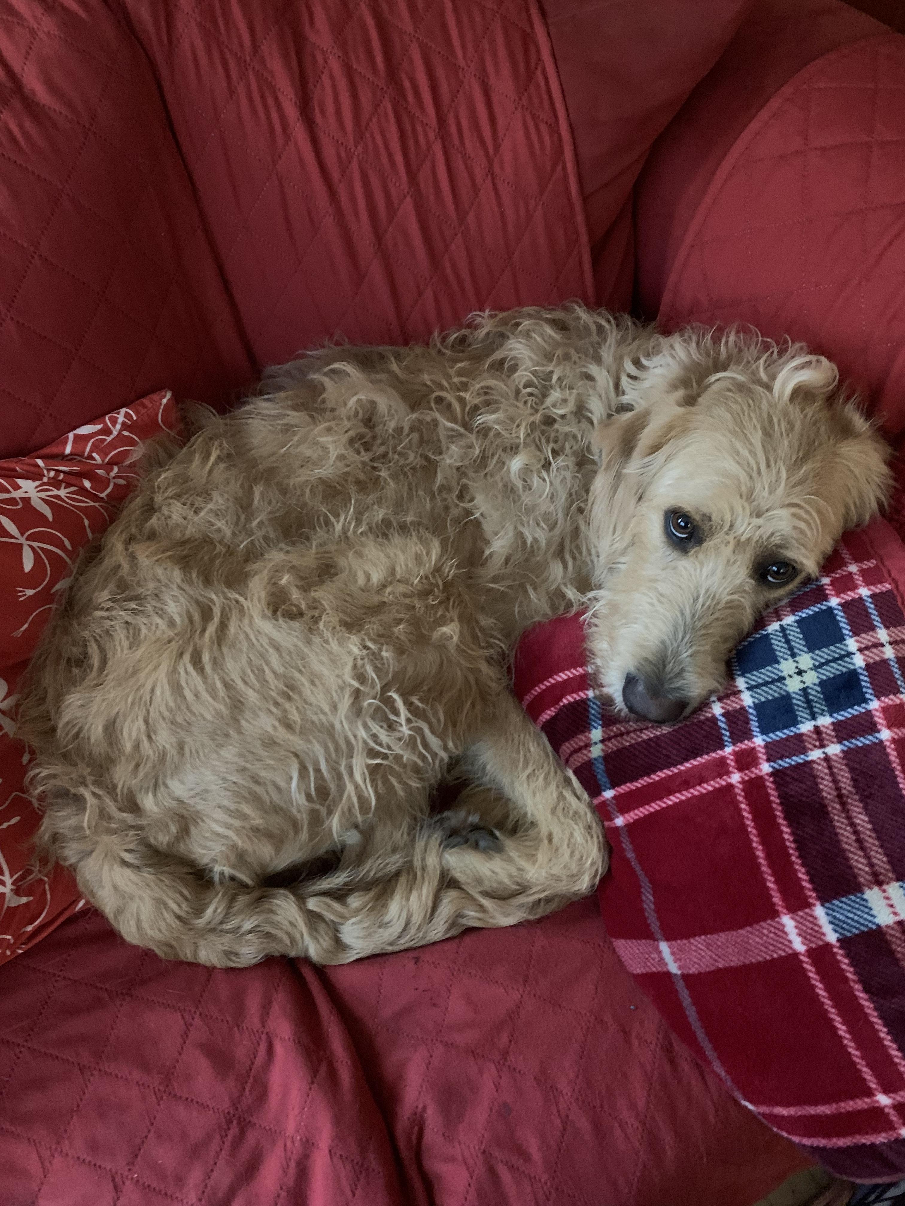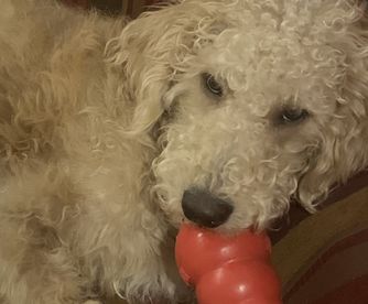 Golden colored labradoodle F1. ( Zoe's mother is an AKA Labrador. Her father is an AKA champion red poodle (from Coplar Poodles in Orting, Wa). He has taken nat/intl awards. Zoe has a lot of her father's attributes which include athletic agility, an intuitiveness and empathy. She is intelligent, quick witted, and learns quickly. She is people focussed and has a sense if humor. think she could be could have been a Service dog, or a show dog, etc. She loves to run and play ball and jimp