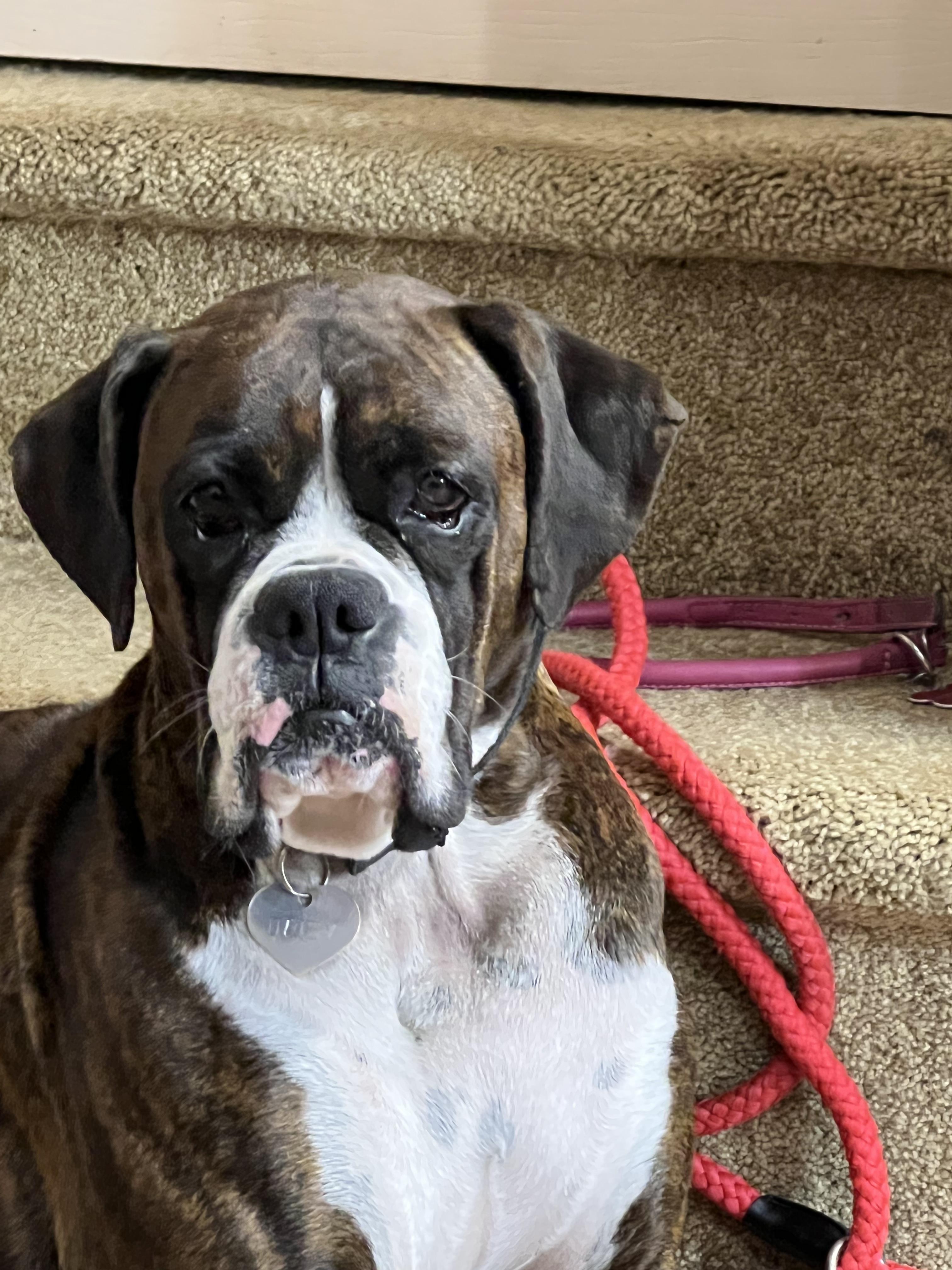 Jolene is our snuggle buddy. She likes sitting right next to you and her paw always finds its way into my pocket; I don’t know how she does it. She loves to run and play with the others or she just chills looking at what’s going on around her. You will find her taking dips in the river and then basking in the sun. She is our best listening dog and has good recall. She is a well boned, wrinkled faced Boxer who is just a sweetheart. Jolene weighs 67 pounds and has a fleshy build.