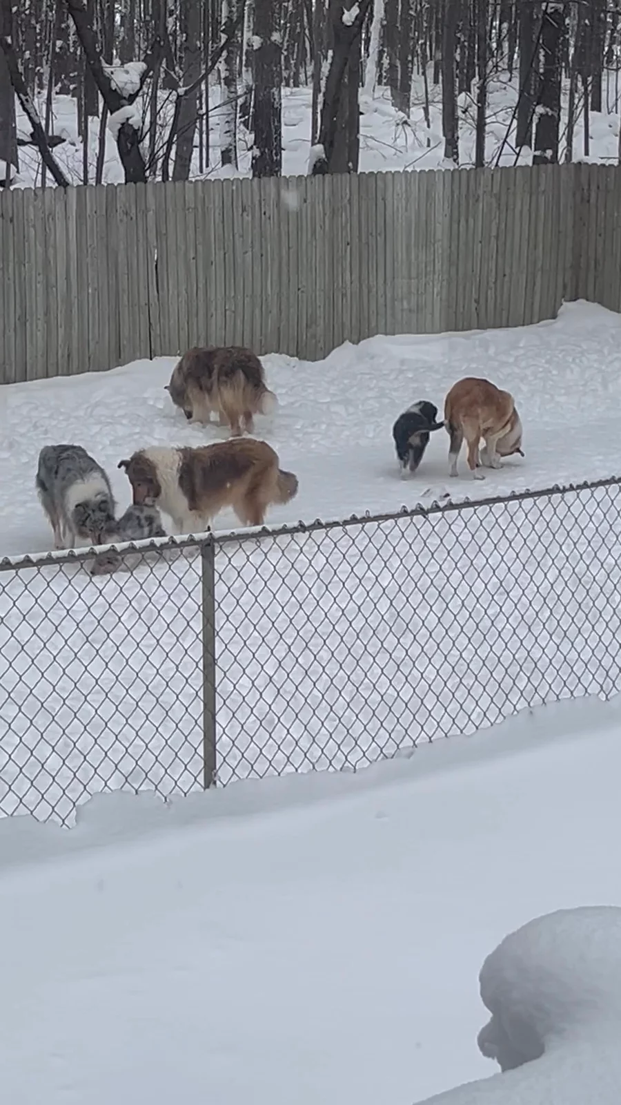 Puppies are playing with the big dogs now! Enjoying their time in the snow ❄️