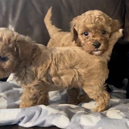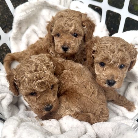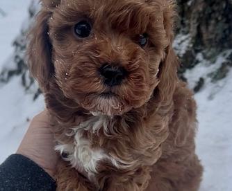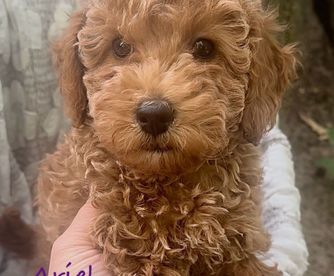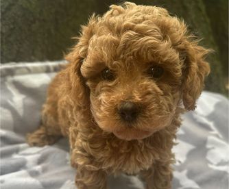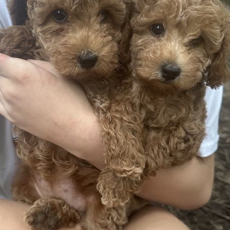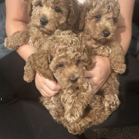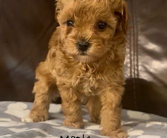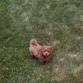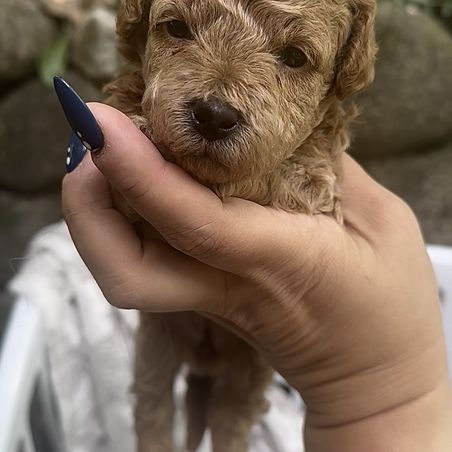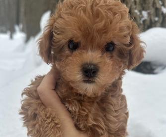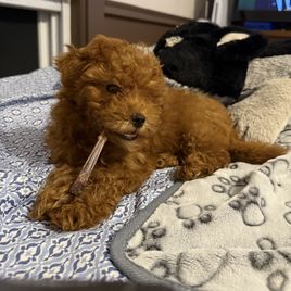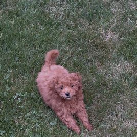 Mizer is our stunning Red Toy Poodle. His coat is a deep red & at 3 years old he has not faded like many poodles do. He is 11lbs & is a carrier for both mini & tiny toy poodles. His personality matches his stunning looks. He loves my young kids & is such a cuddle bug.