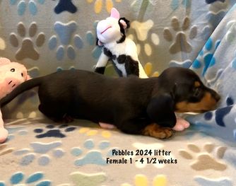Pebbles is a female Dachshund. Carefully selected as a great representative of her breed, Julie decided to make her part of their program. Julie has passed Good Dog’s screening process, which involved a review of their breeding practices, environment, and the mental and physical health of their dogs.