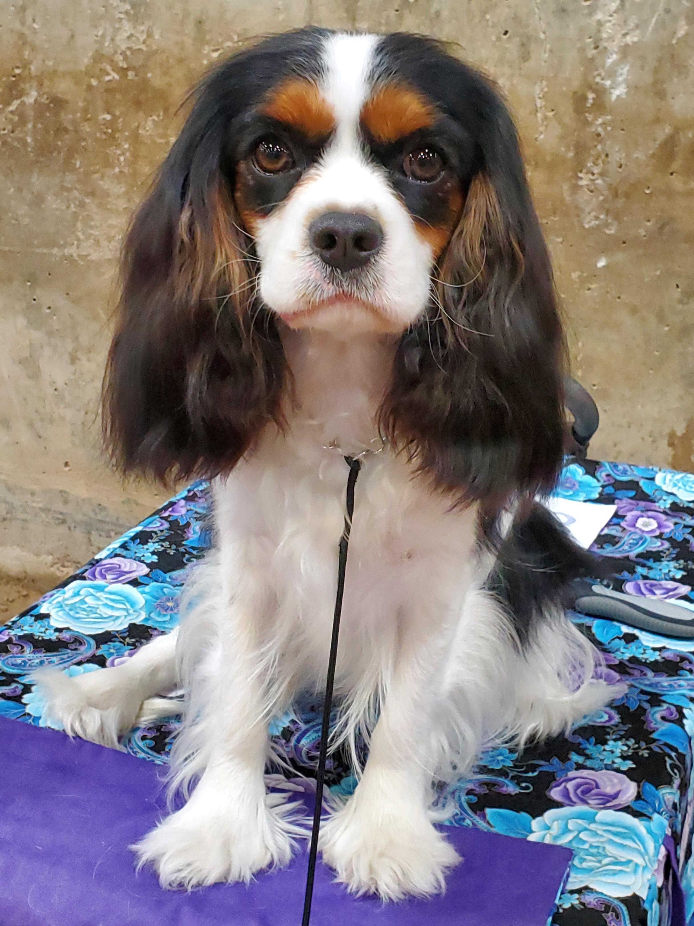 Elara is a very outgoing, friendly, sassy gal. She hasn’t met a person she doesn’t like or that she doesn’t think is her best friend. Elara, “Ellie”, is a great dog for people who are timid around dogs, and while she can be super energetic and opinionated if people are comfortable with her, she is also extremely gentle and slow with those who are frail or fearful. Ellie is smart and thrives when learning new things. She competes in conformation and rally, and her next goal is to become a certified therapy dog. Currently, Ellie’s job is to be head supervisor at the vet clinic I work for. She’s more than happy filling in as our CSR or keeping the rolling chair warm in the back area. Elara is exactly the personality we strive for in the Cavalier breed. She’s also very pretty with great health clearances as well as a not-too-short face.