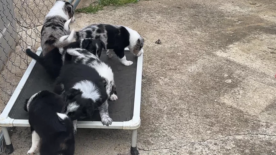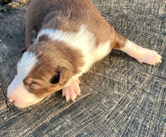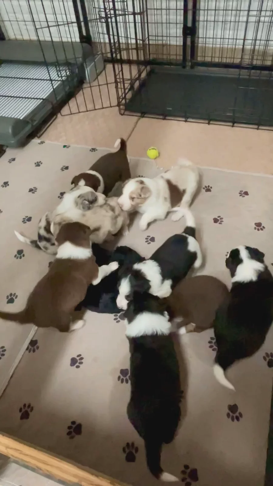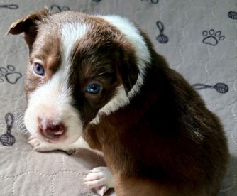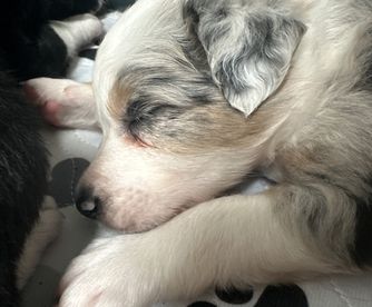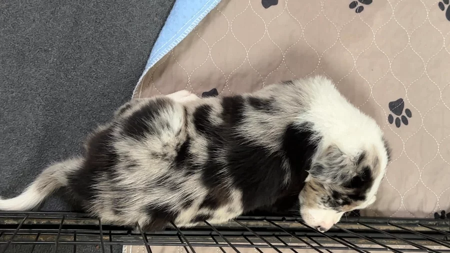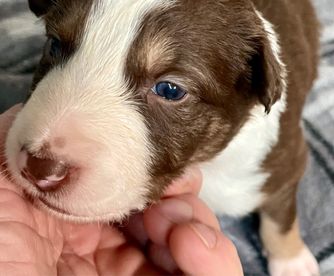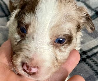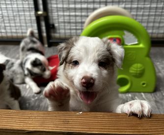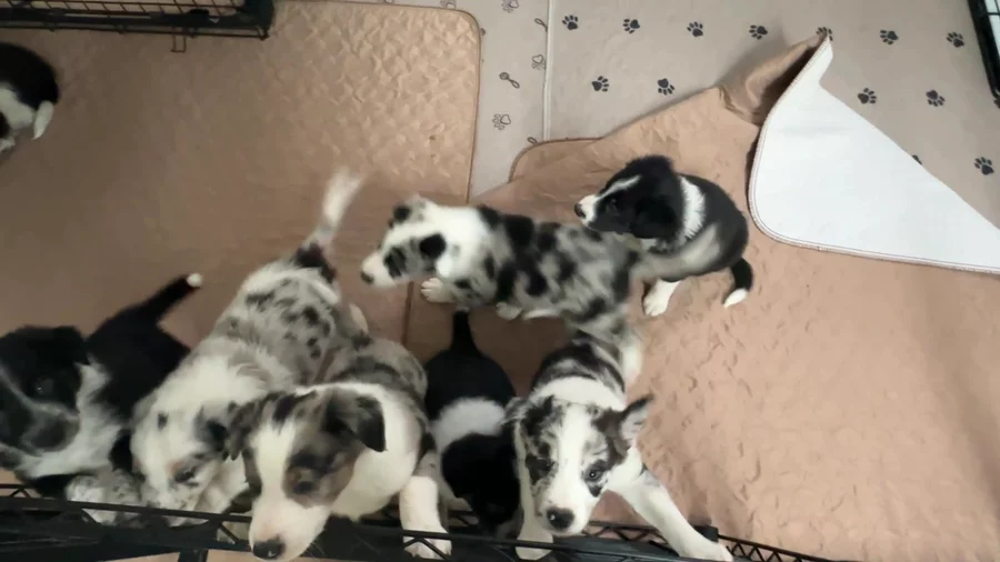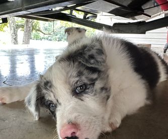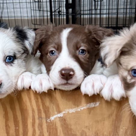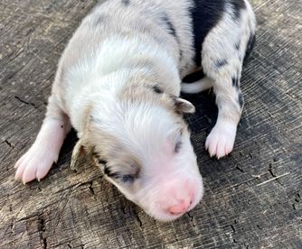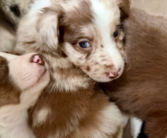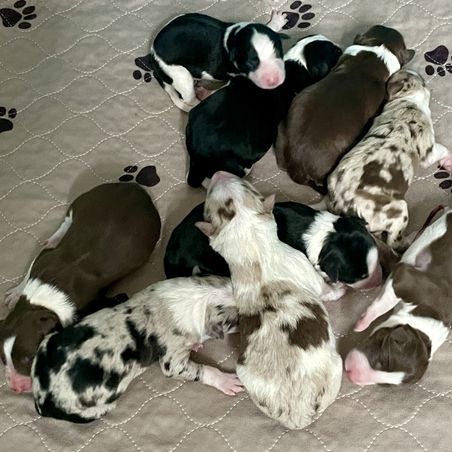 Our puppies include lilac merle, gold merle, blue merle, white and blue merle, and white ticked. Colors will vary depending on the parent dogs.