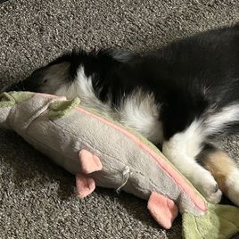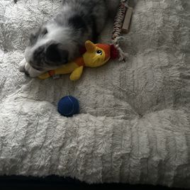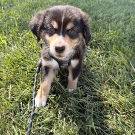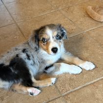 Stormie is a beautiful blue merle. She is so fun and sweet to be around. She is a true “velcro” dog. She loves playing fetch and running around exploring with her pack.