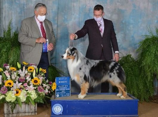 Chance is the happiest, teddy bear look-alike Australian Shepherd you’ll ever meet! He has done wonderfully in the show ring, and we are thrilled to see what he will contribute to our program. With a fabulous, well-balanced pedigree, beautiful structure, and effortless movement, he is truly a joy to watch—gliding across the yard with ease.