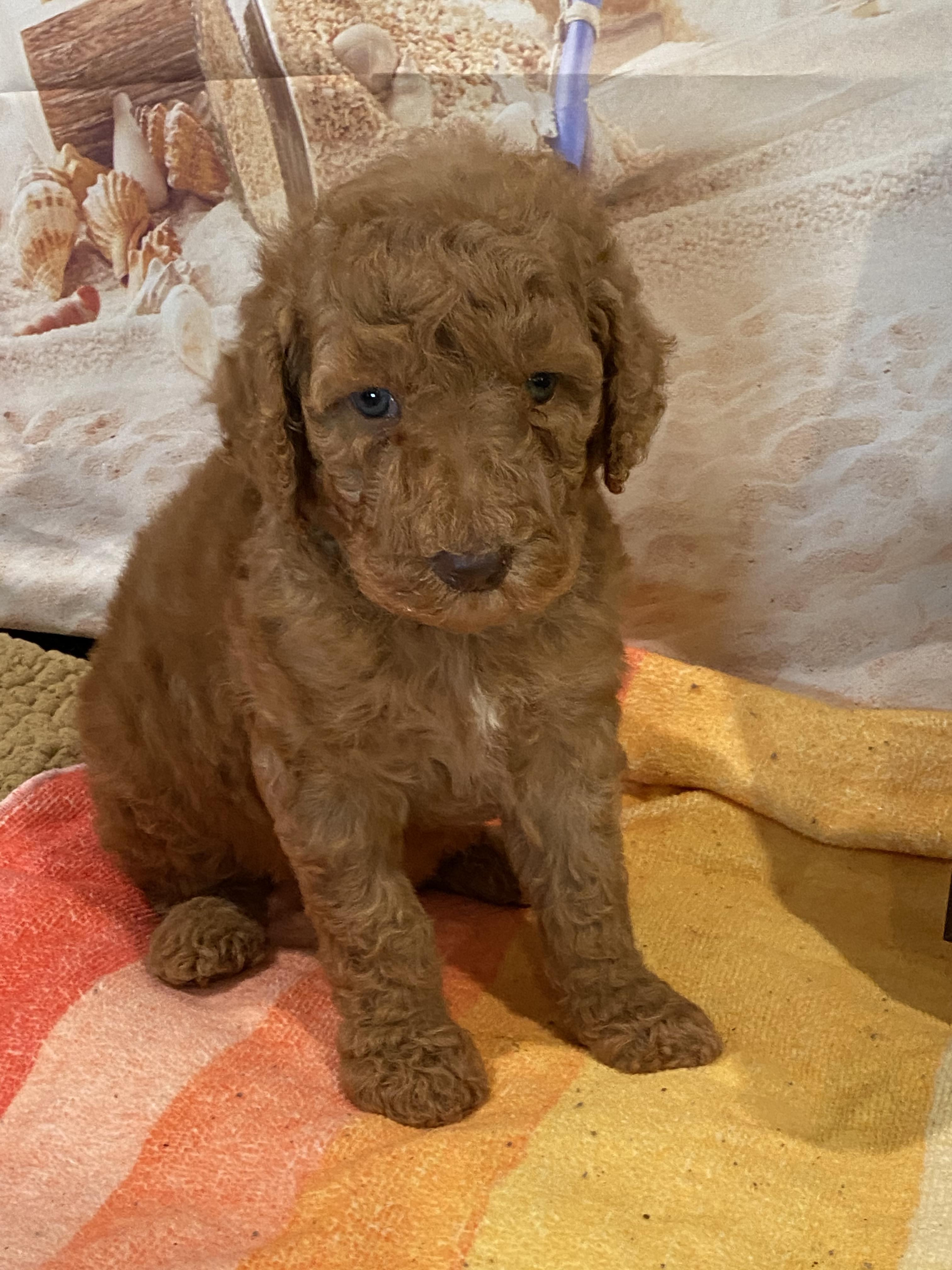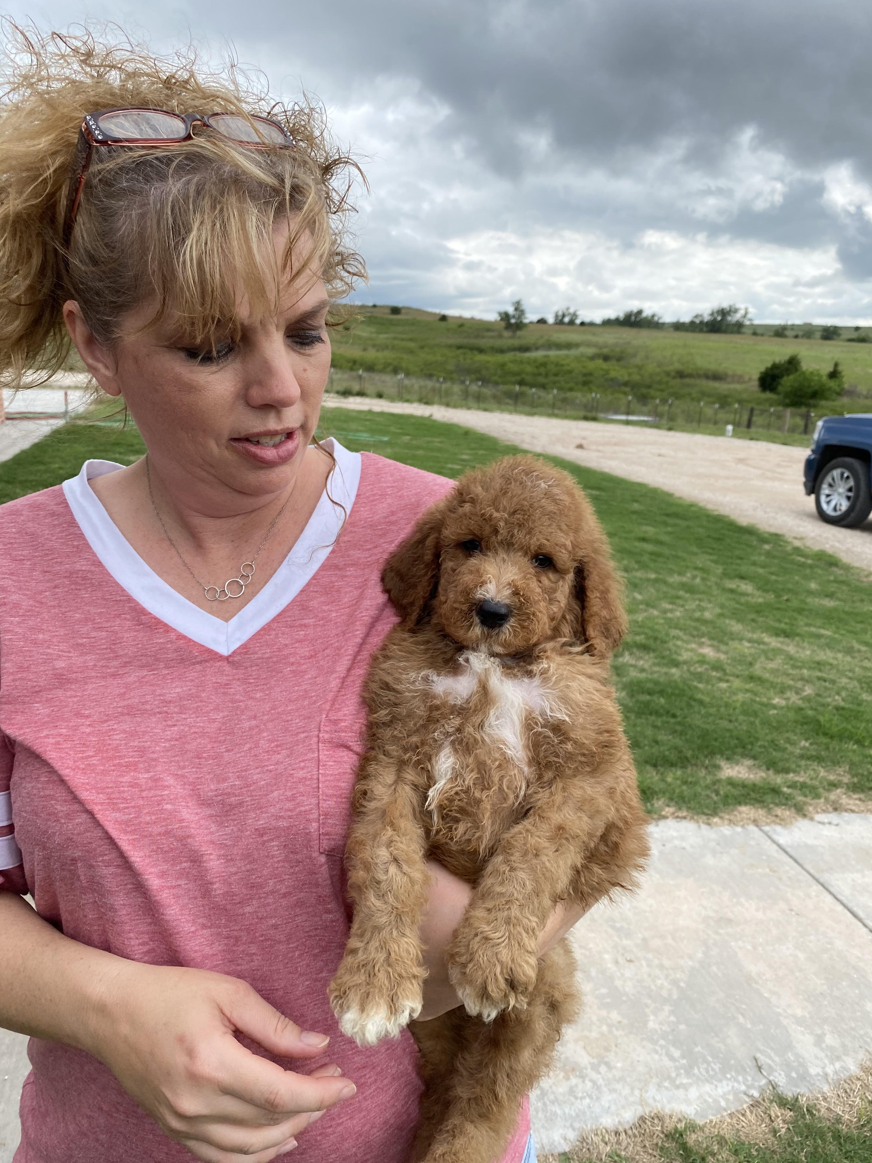 Our oldest son purchased the most beautiful Australian Shepherd I have ever seen. I fell in love with this sweet girl and found myself kind of taking her for my own. We knew our empty nest was coming just around the corner. My husband suggested that we purchase a puppy for me. I loved the idea. He suggested that I look into Poodles. I found some with the teddy bear cut and immediately fell in love. We decided a smaller dog would not be in our best interest with living on a farm so I started searching for my new best friend. I found a place in Oklahoma that actually had a litter of the royal size Poodles, and the red color I was searching for. We put down a deposit and picked up our Cassie on October 24, 2018.