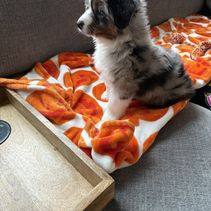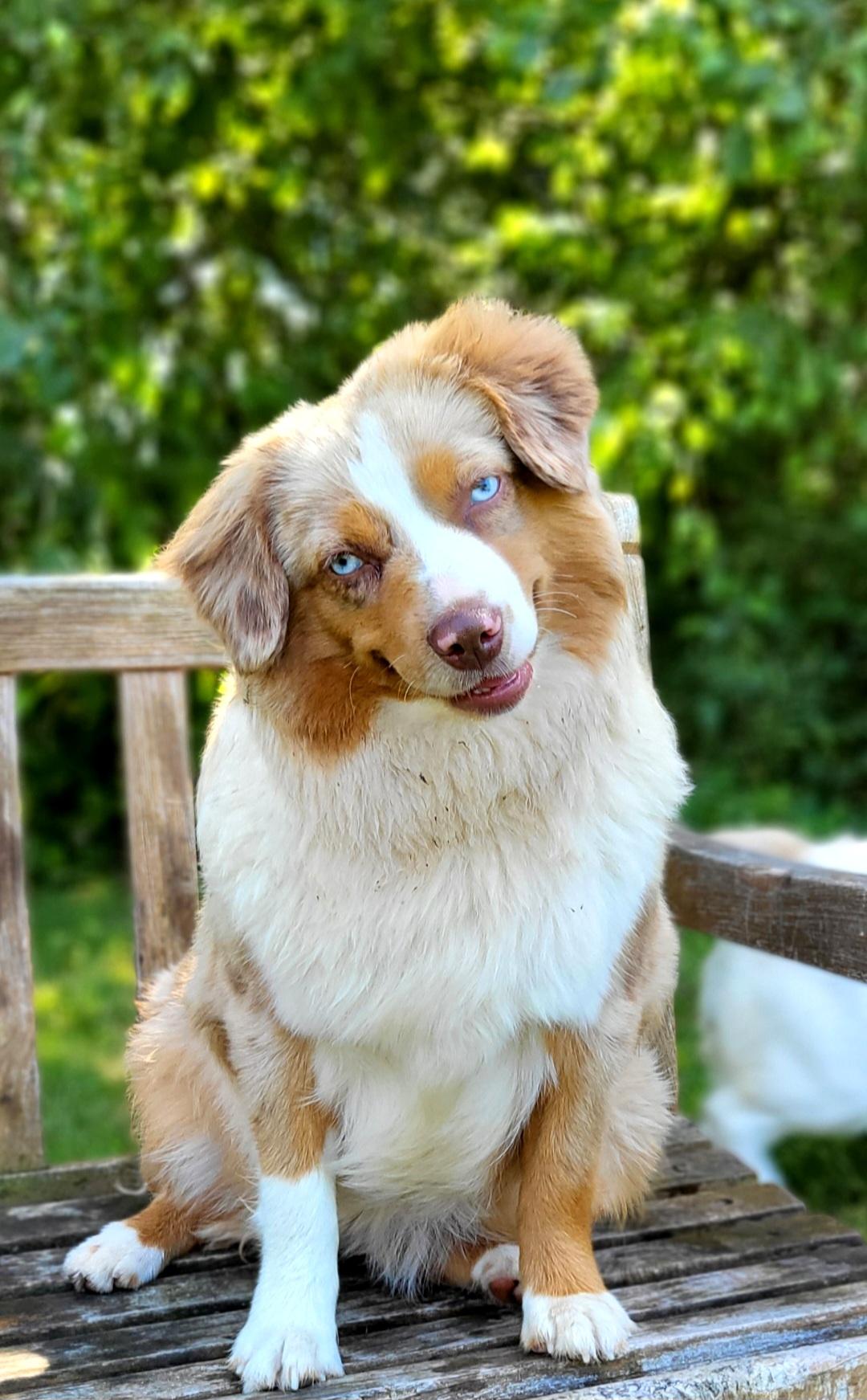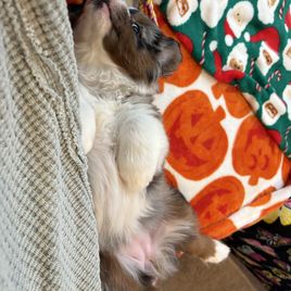 Skye is our beautiful blue-eyed red merle female with CH bloodlines. Her temperament is phenomenal. She is loving, calm-natured, playful & friendly... and loves her people! Her favorite pasttime is cuddling & belly rubs. Her groomer made the comment "I have never met a miniature american shepherd with this wonderful temperament!"
