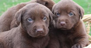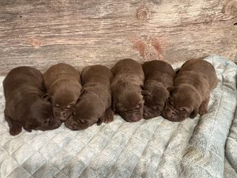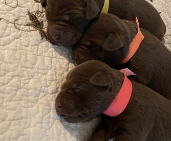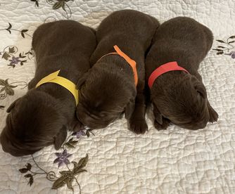 Our German Shorthaired Pointer puppies include liver roan, liver and white, black roan, and black and white. Labrador Retriever puppies include black, chocolate, and yellow. Colors will vary depending on the parent dogs.