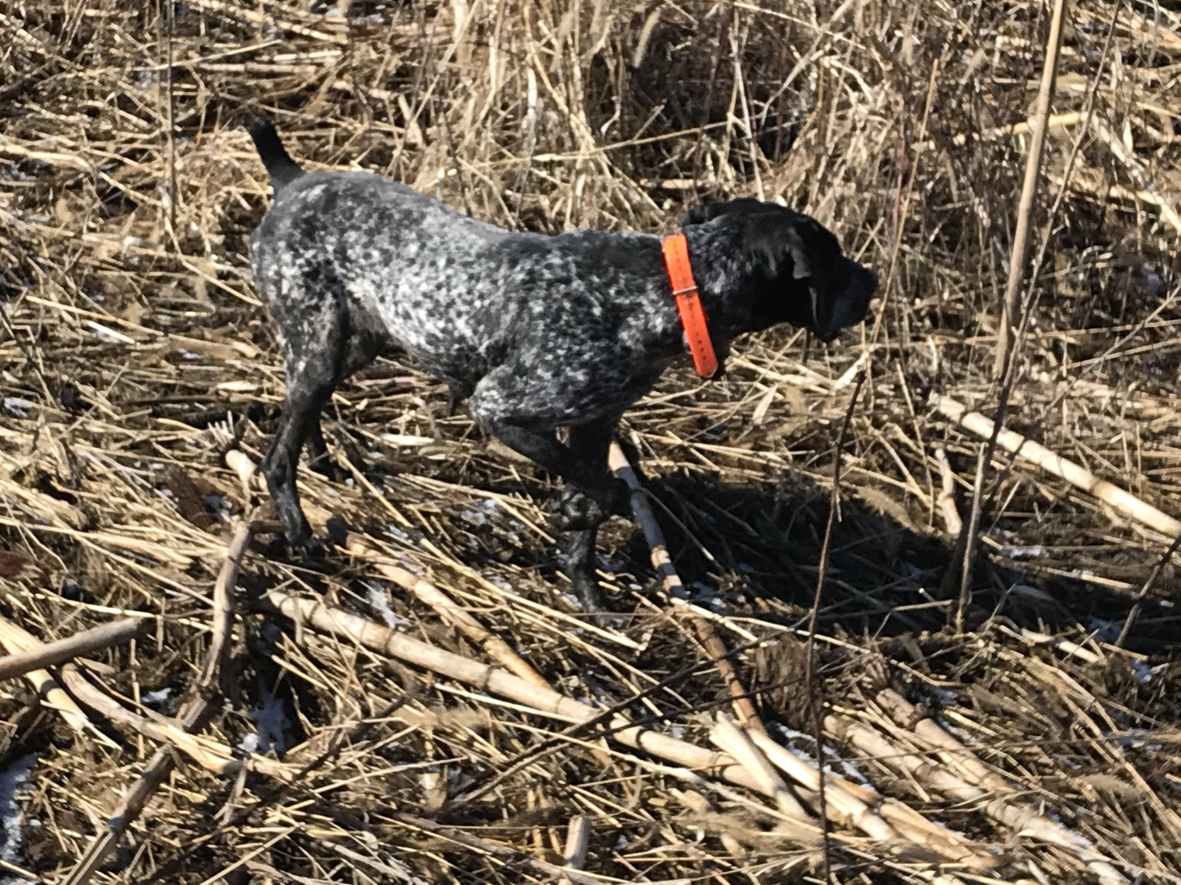 Sage has Champion Field trial bloodlines along with pointing lab bloodlines and pass these qualities along to her pups. She is an excellent mother to her pups. She is OFA Good, Normal Elbows and clear on the top 5 panel DNA tests. She is happy both hunting upland or waterfowl, and then loves to cuddle with her family as well. She gets along well with all other dogs, and helps to teach the younger ones how to behave.
