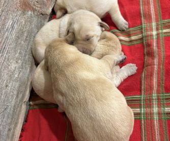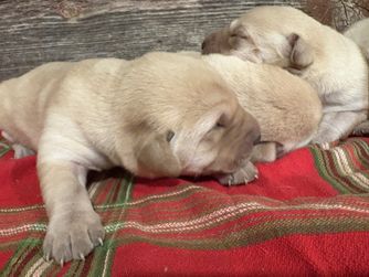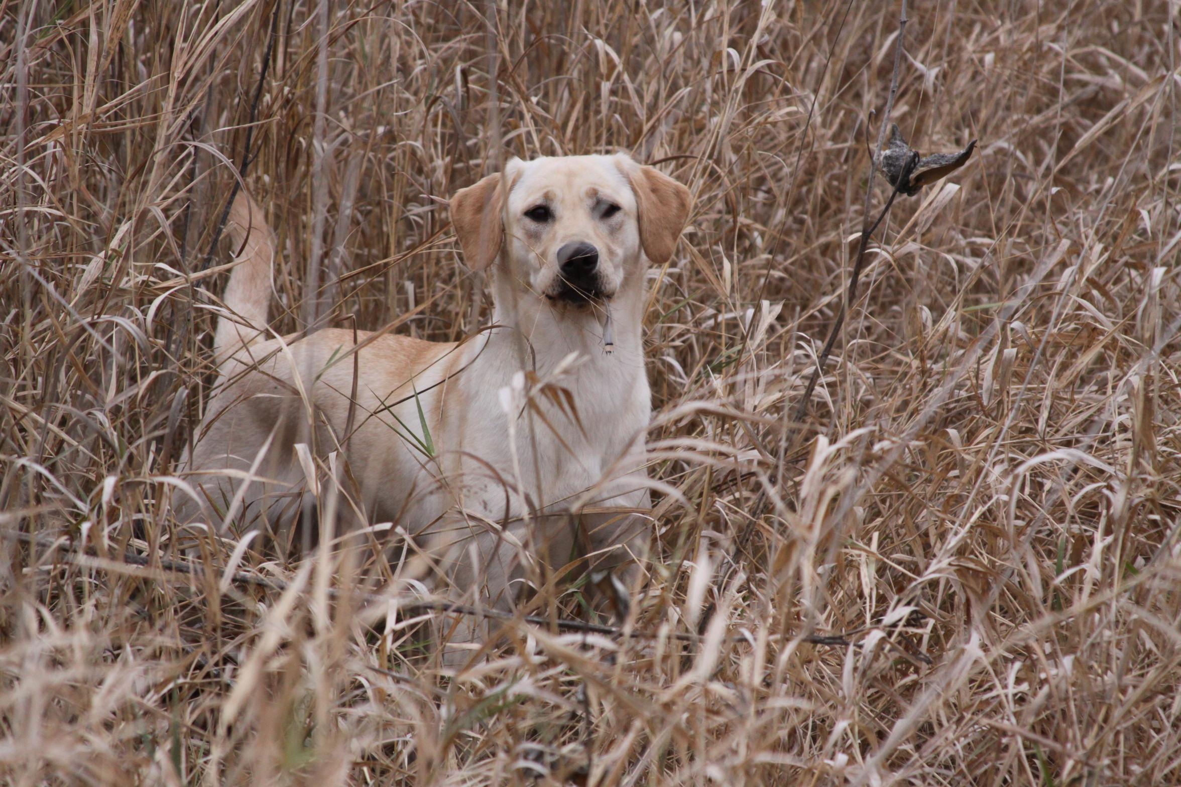 Shark has champion field trial bloodlines and APLA pointing lab bloodlines. She is a beautiful light yellow (almost white) in color. She has excellent confirmation, OFA very good, normal elbows, and clear top 5 panel on genetic testing. She is great out in the field and also a great family companion. Gets along well with other dogs and kids.