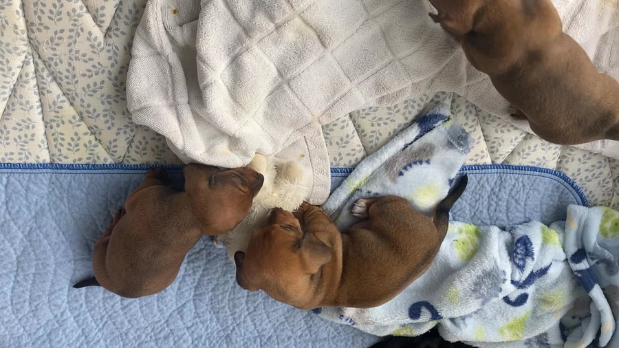 Puppies are 4 weeks old today! 2/18/26! Time is sure flying .. starting to eat solid food this week and playing with their little lamb chop!