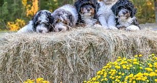 Our Bernedoodle puppies are tri-color. Cavapoo puppies include black and white and apricot. Colors will vary depending on the parent dogs.