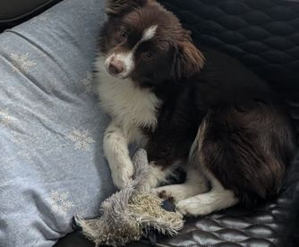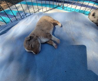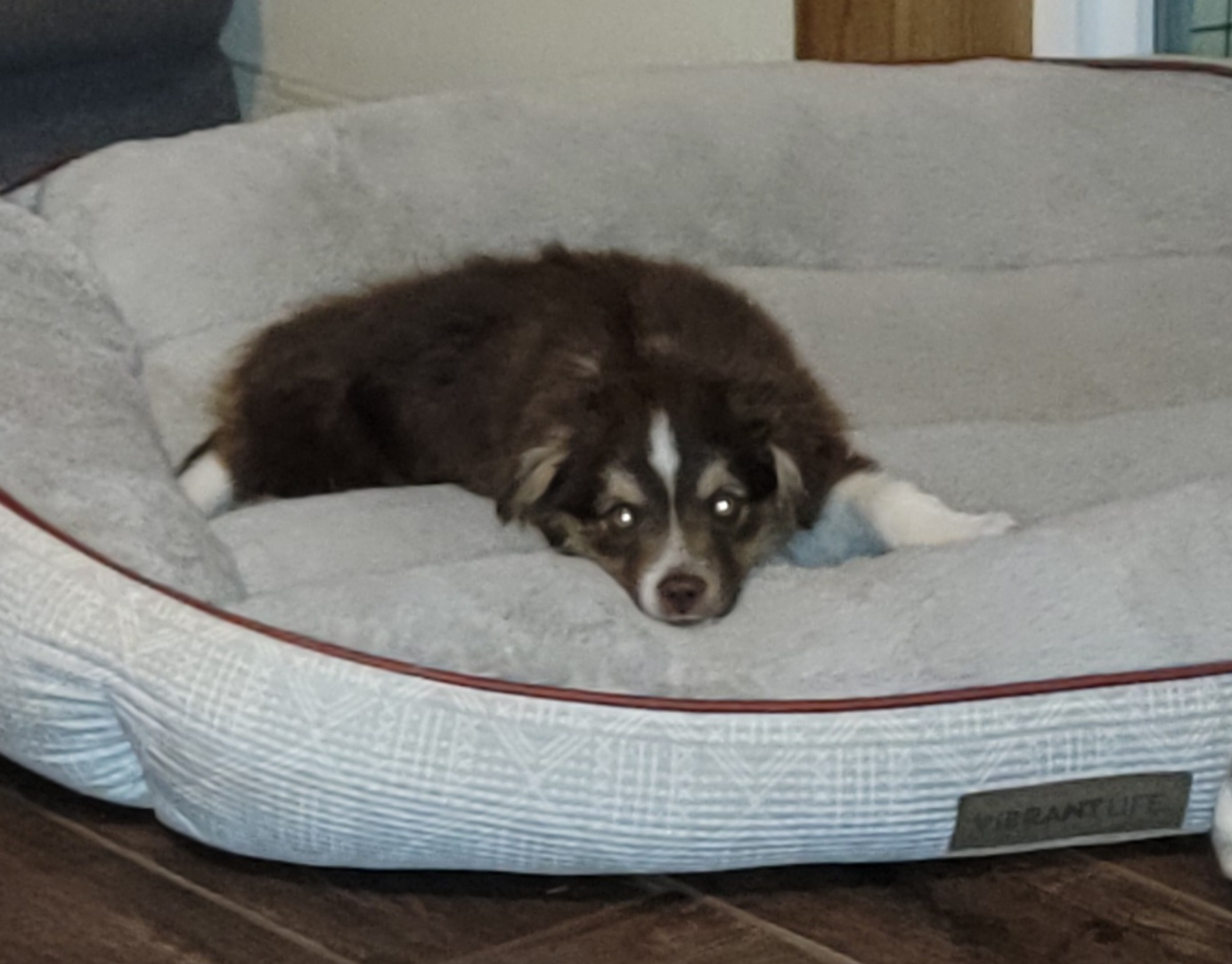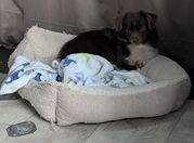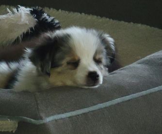 Stella is a registered red tri with lots of personality. She is an excellent mom, she loves to give kisses, sleeping on your lap, will shake for a treat, she likes to go under to covers & is just a joy to have in our household