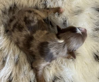 Charlie is the sweetest boy he stands 10” tall and weighs in at a whopping 6lbs. He loves belly rubs and loves to play with his kids. He enjoys being a couch potato and playing outside. He passes on his tiny size and sweet personality to his babies.